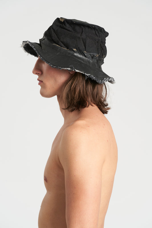 Black Vertically Crushed Cotton Denim + Laminated Paper Hat