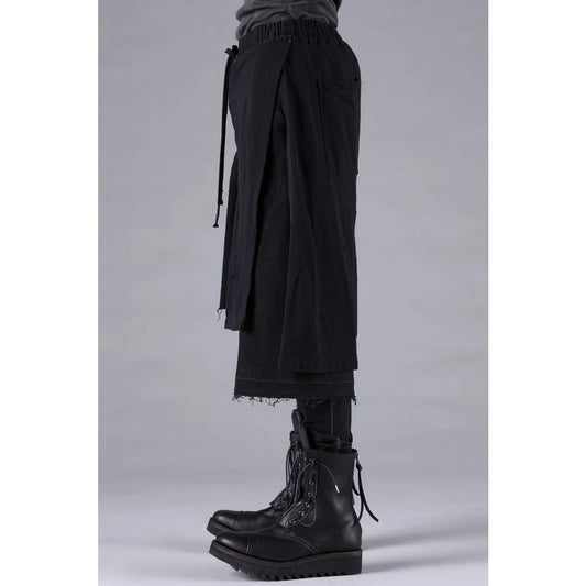 Black Stretch Denim Damage Apron Wide Cropped Pants