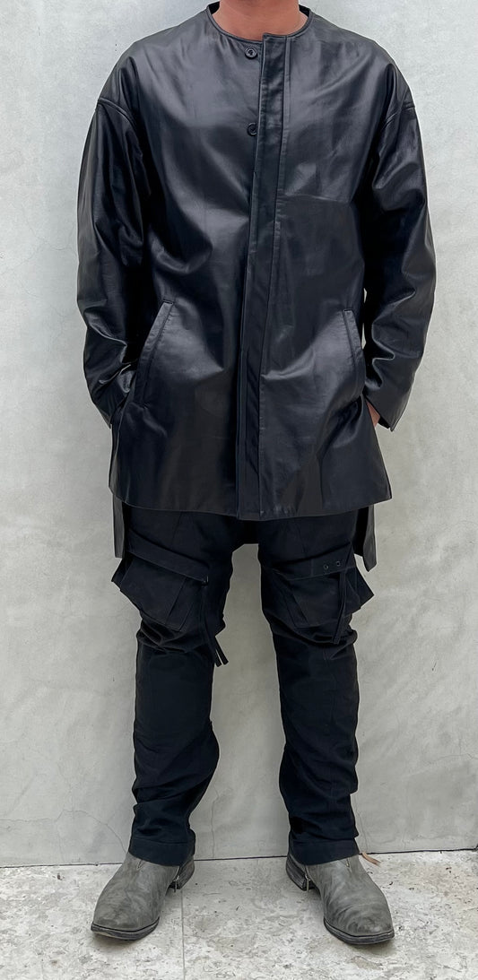 Black Japanese Steer Leather Collarless Car Coat