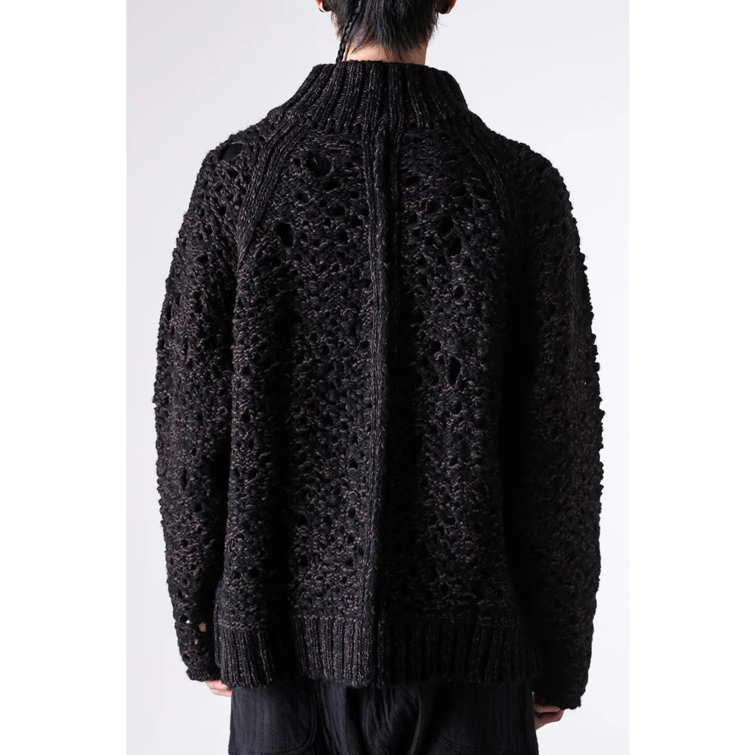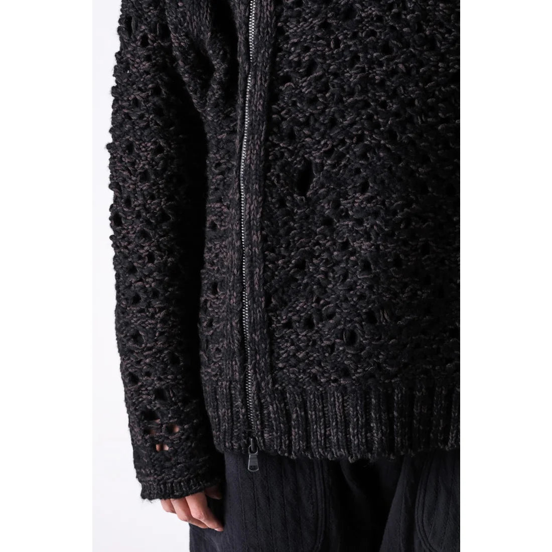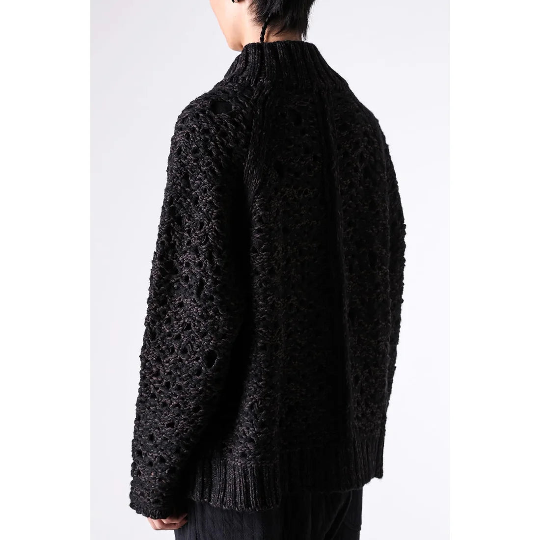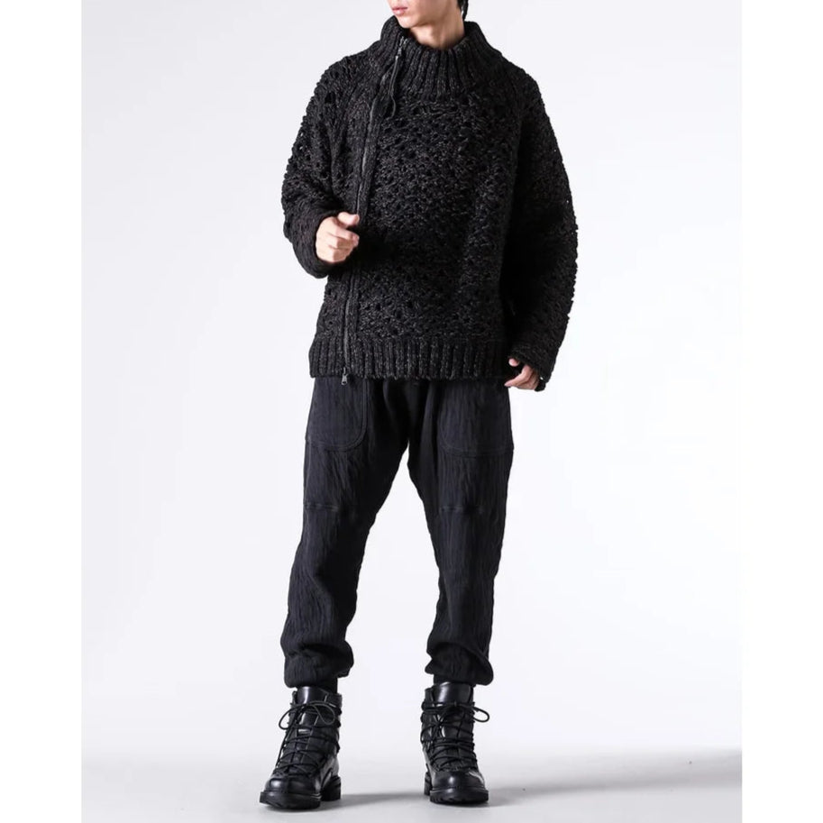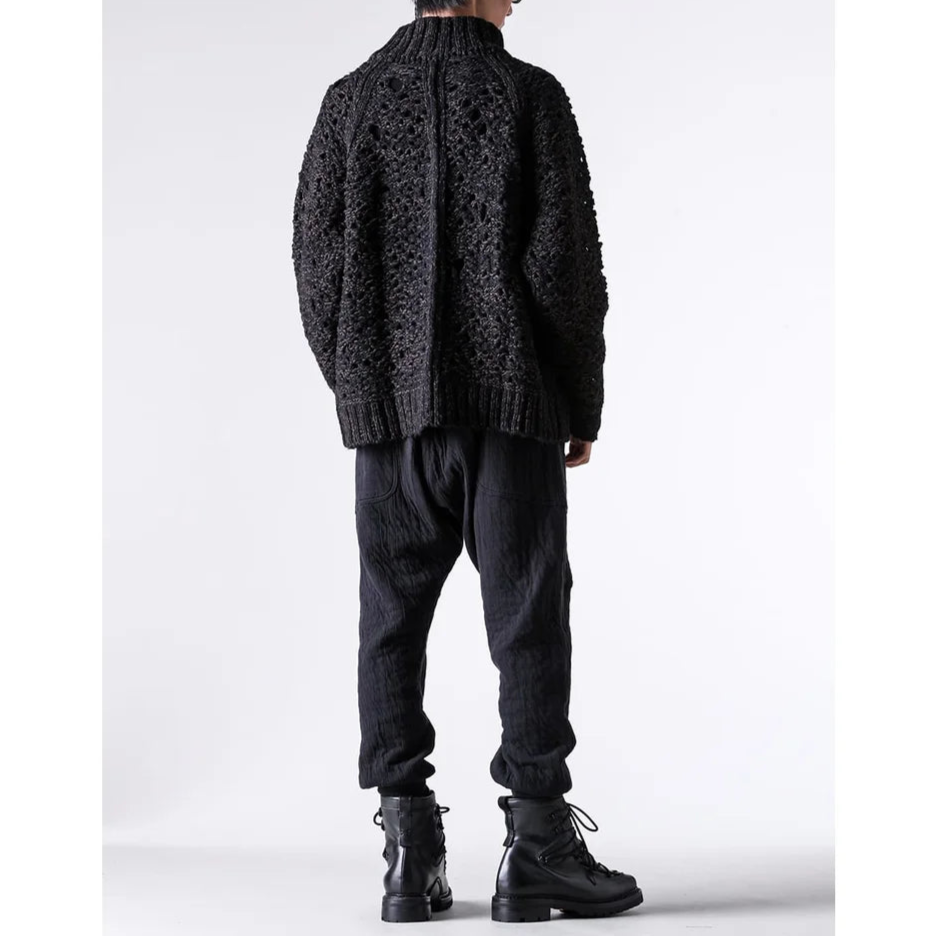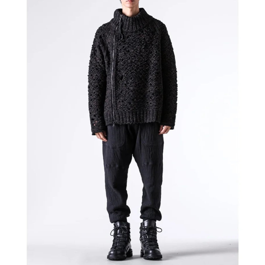 The thick knit fabric is a blend of cotton, wool, and nylon, with a randomly meshed texture that gives it rich expression.