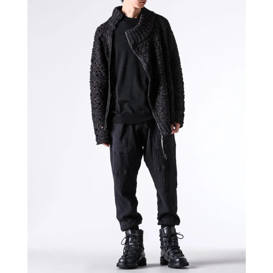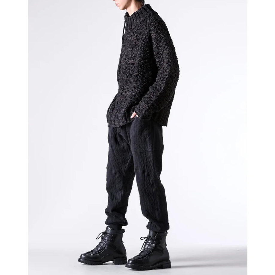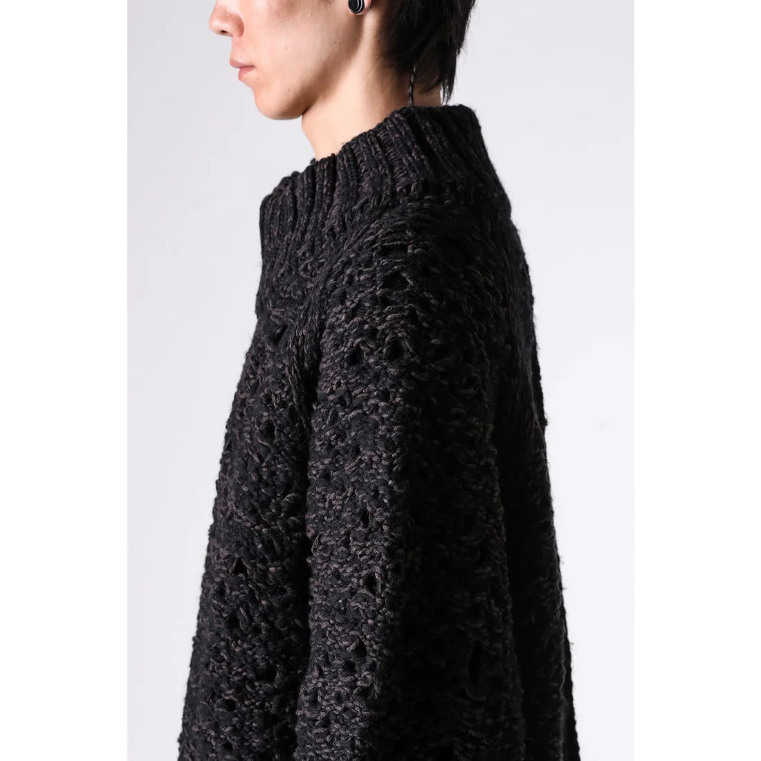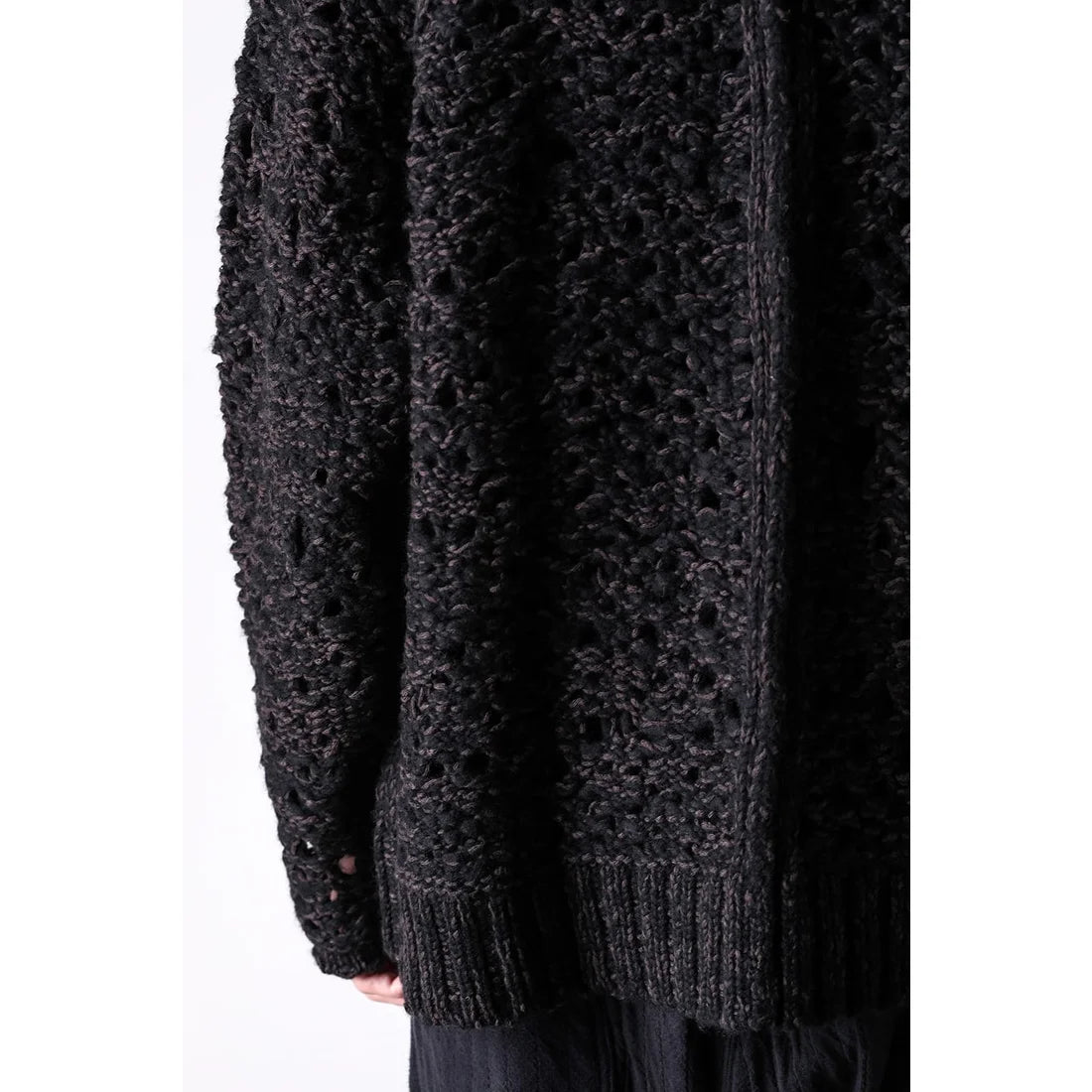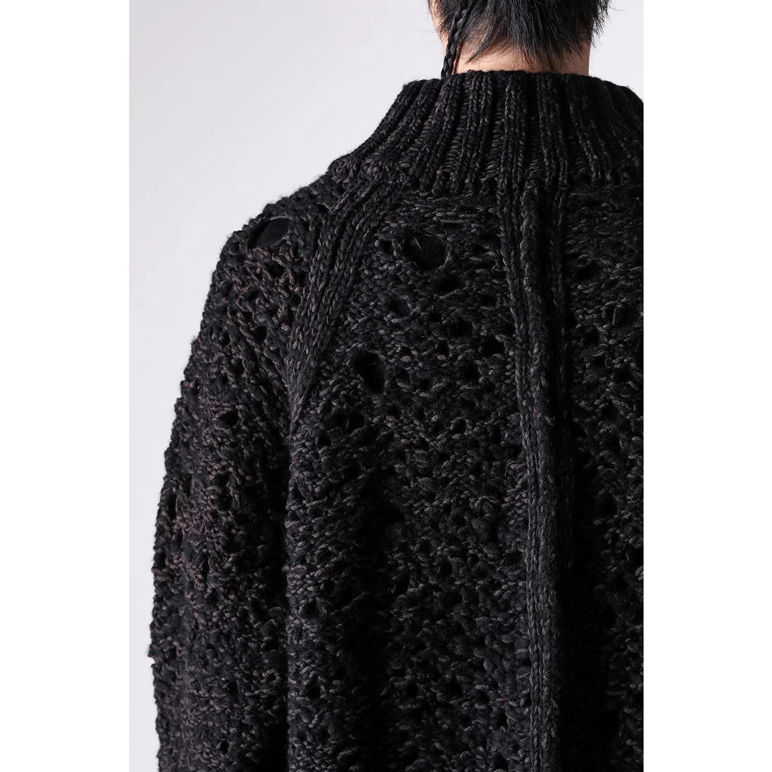 The thick knit fabric is a blend of cotton, wool, and nylon, with a randomly meshed texture that gives it rich expression.