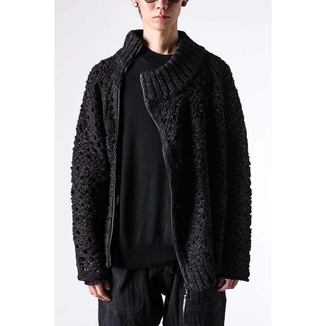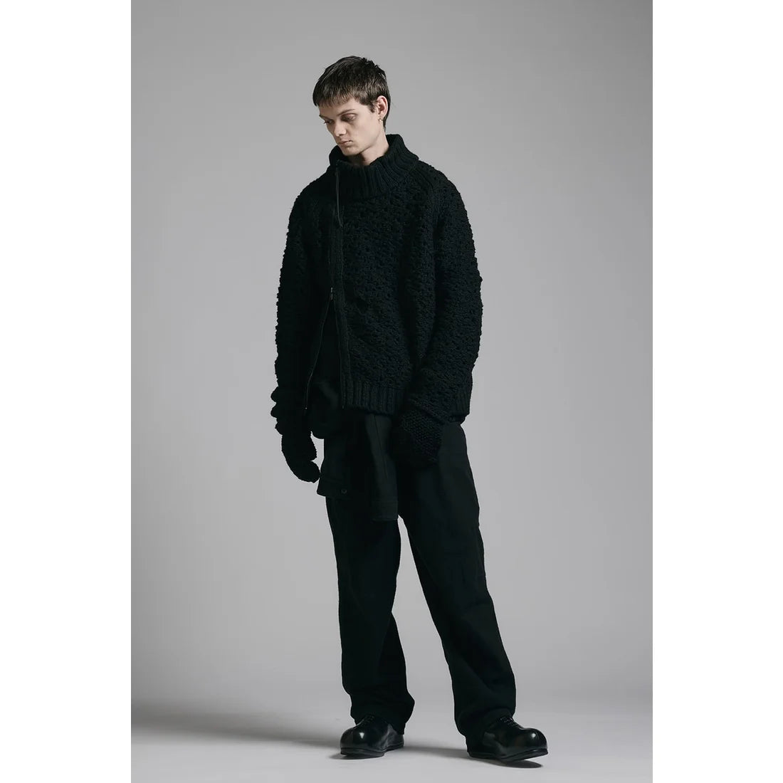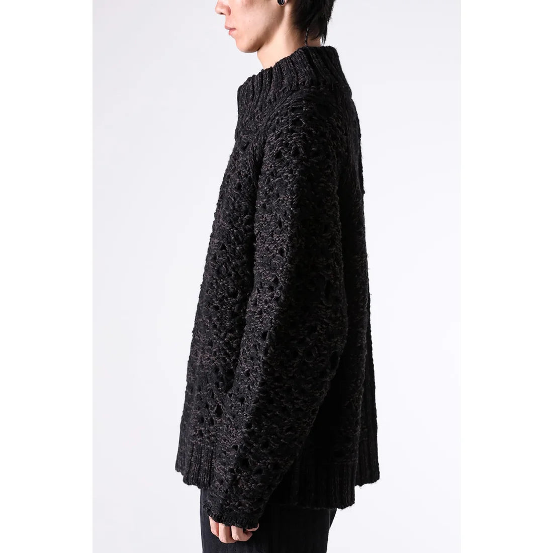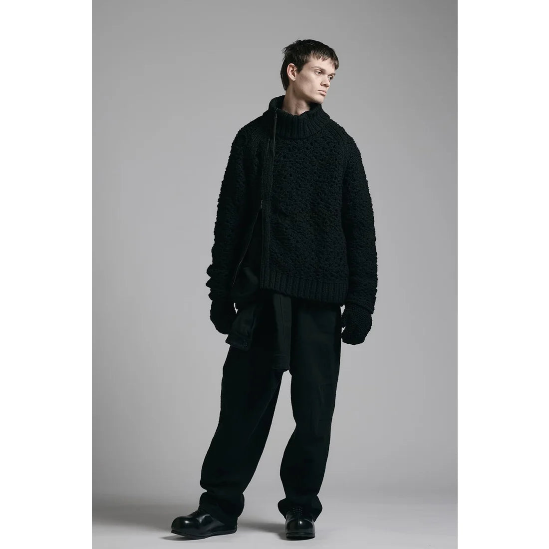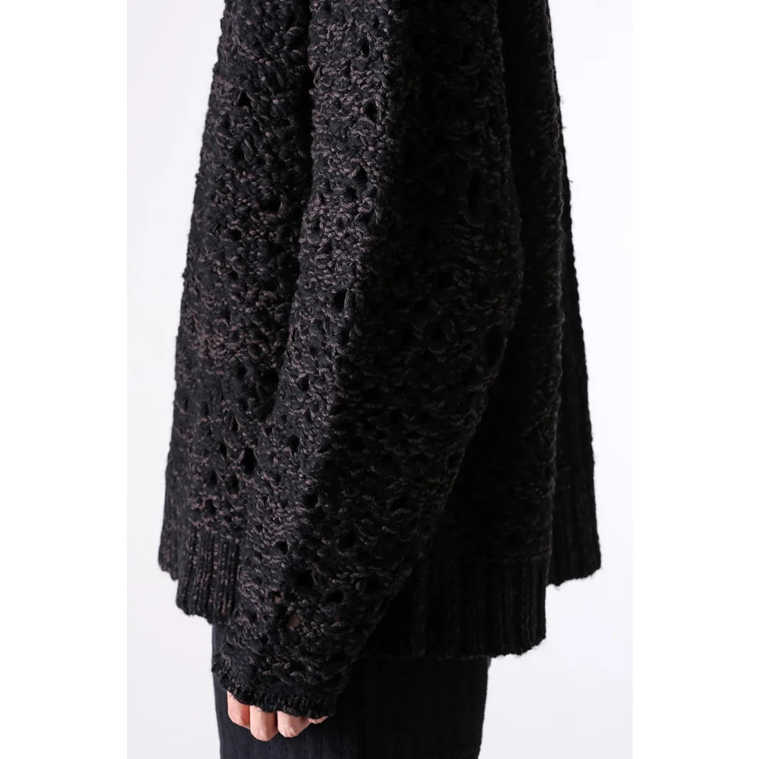 The thick knit fabric is a blend of cotton, wool, and nylon, with a randomly meshed texture that gives it rich expression.