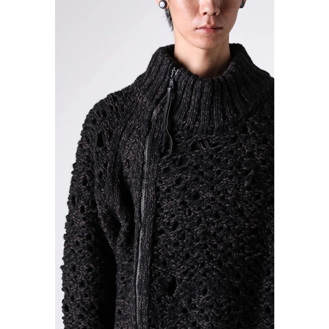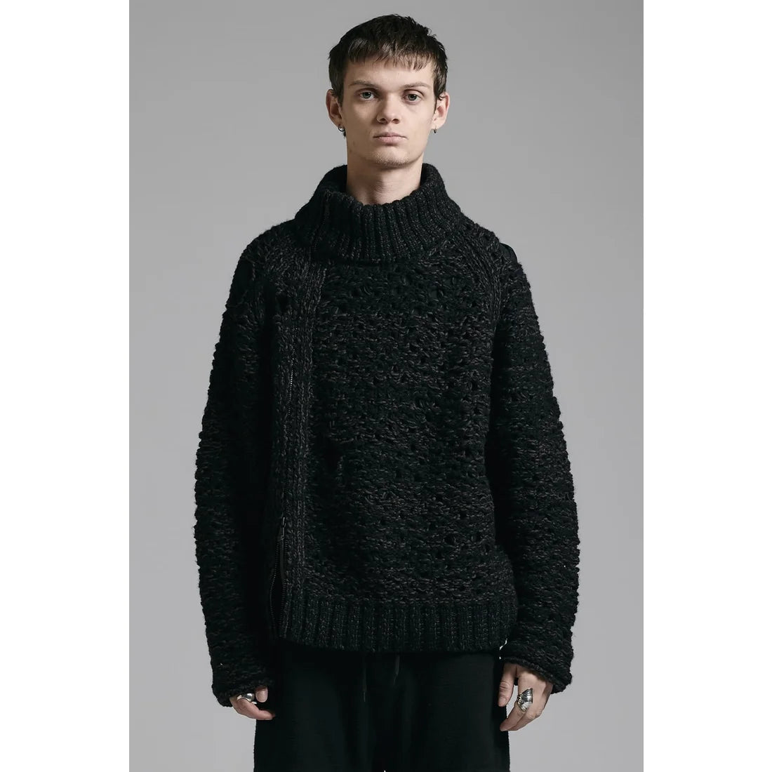 A high-neck knit with a distinctive design featuring a front zipper that curves diagonally.