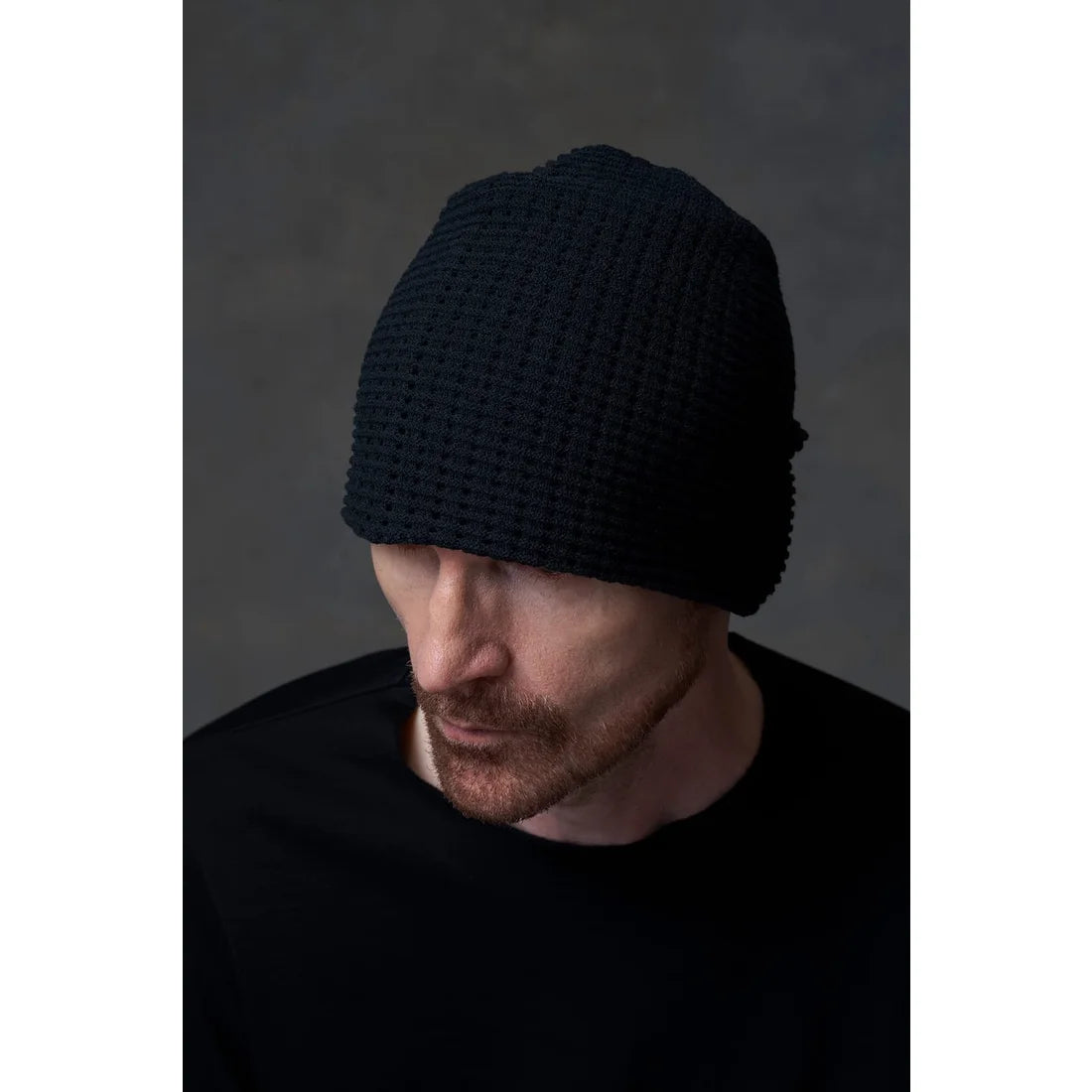 Designed for spring and summer, the exterior features a mesh knit, while the interior is layered with a textured knit, creating a double-layer structure. The knit material is dry and highly breathable, making it suitable for year-round wear. The crown area is intentionally single-layered for a lighter impression. Available in black, bordeaux, and gray.