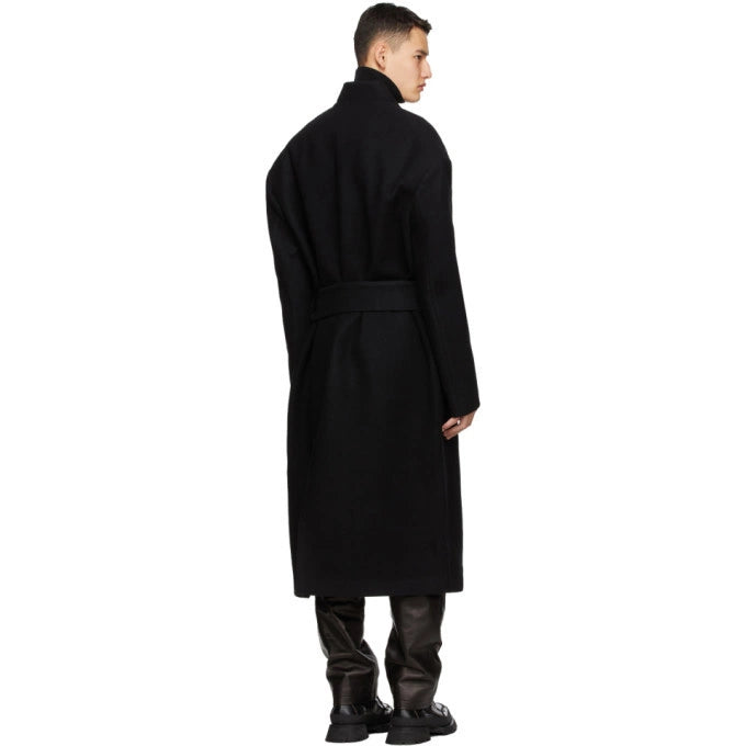 Long sleeve wool coat in black. Stand collar. Embroidered graphic in white and