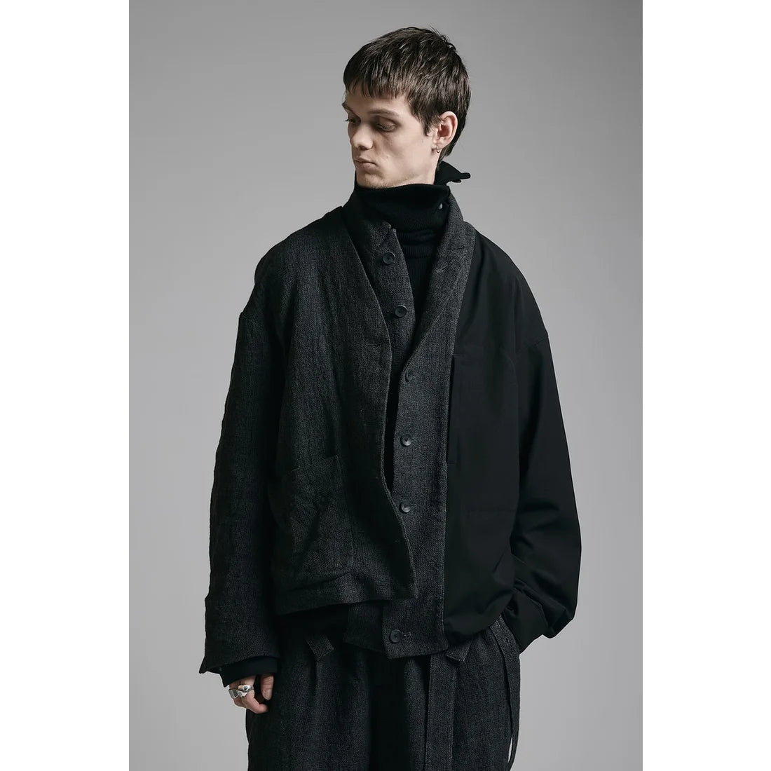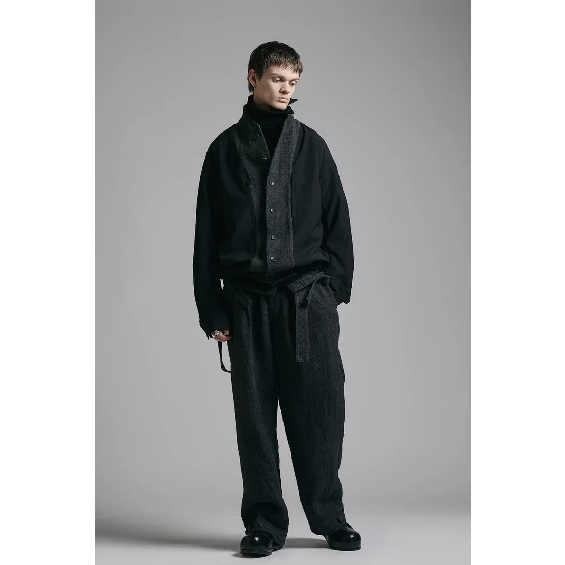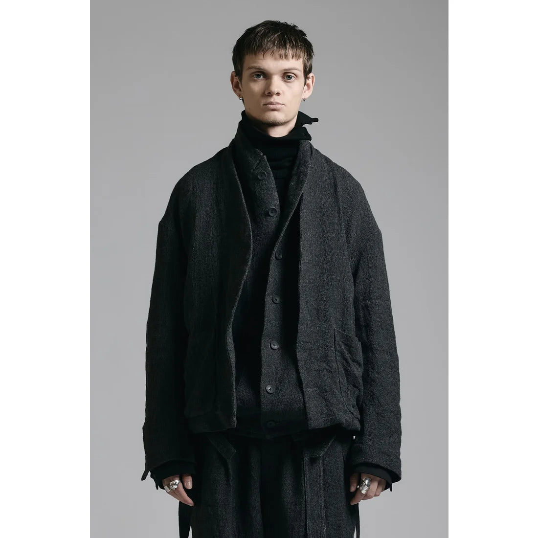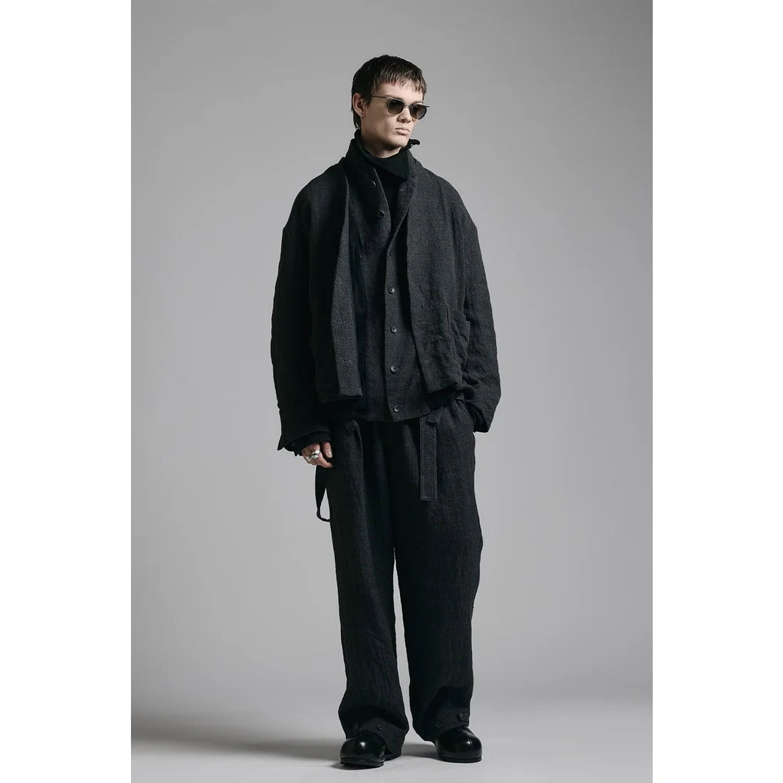 The fabric is a blend of linen and wool, providing warmth along with a soft thickness and elasticity, resulting in a cozy finish.