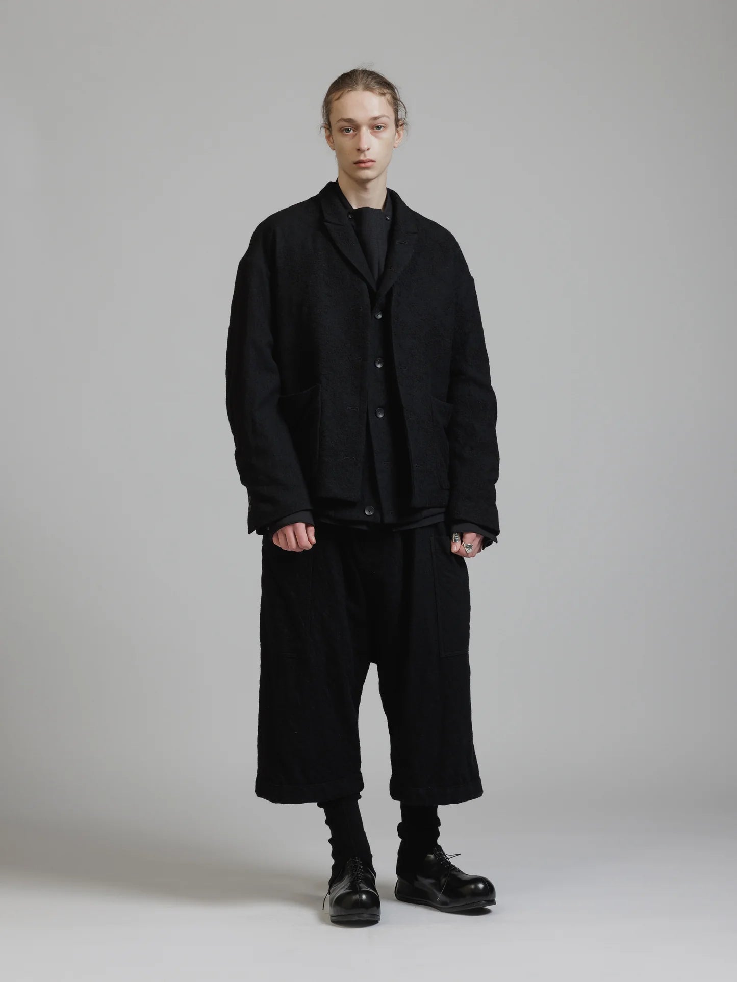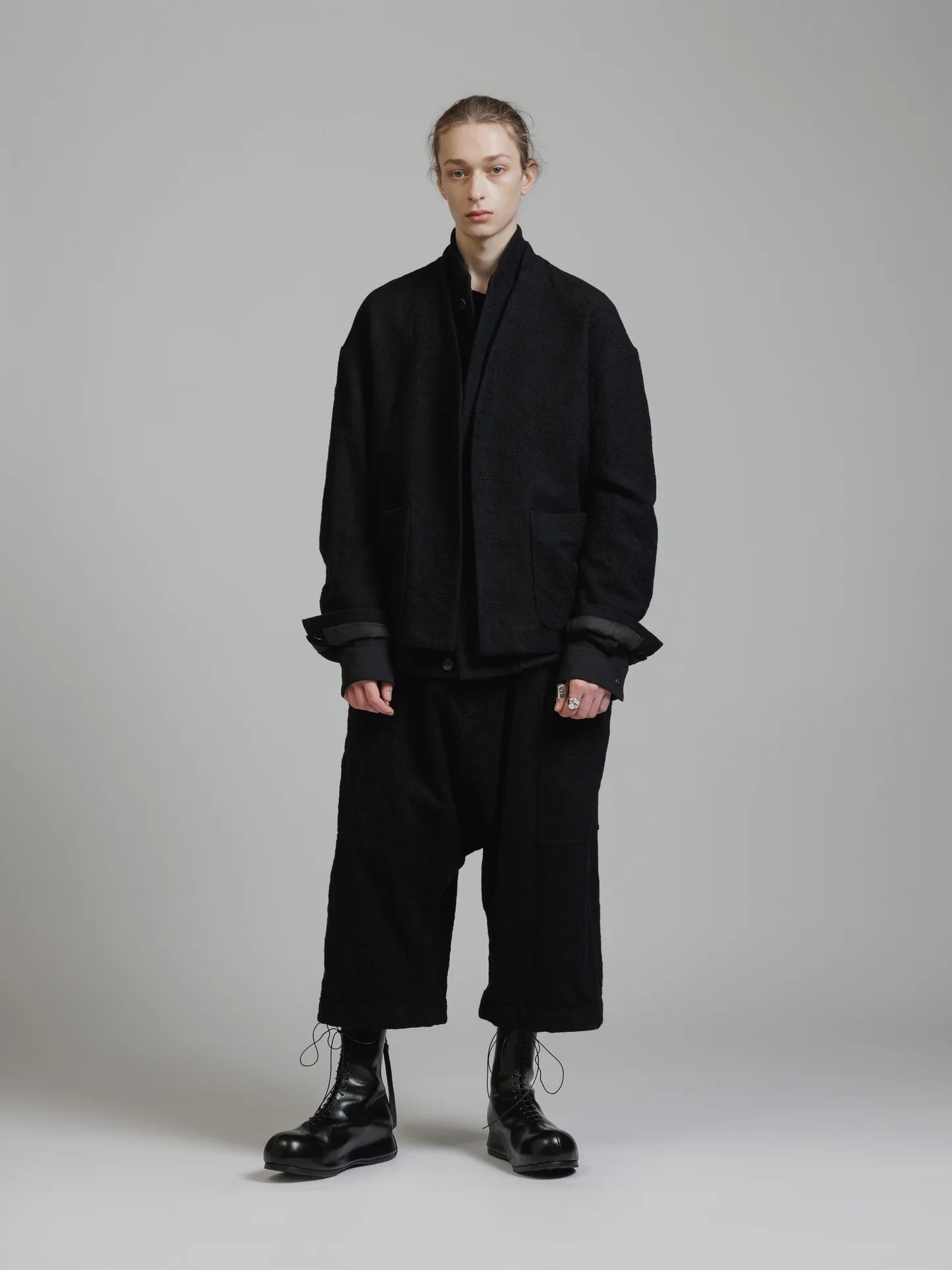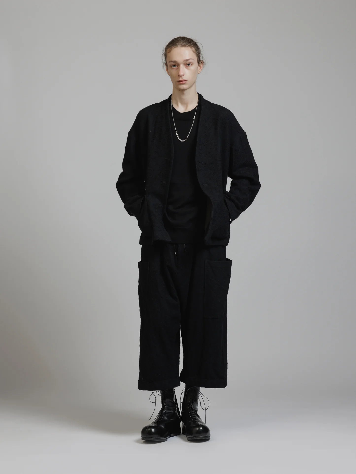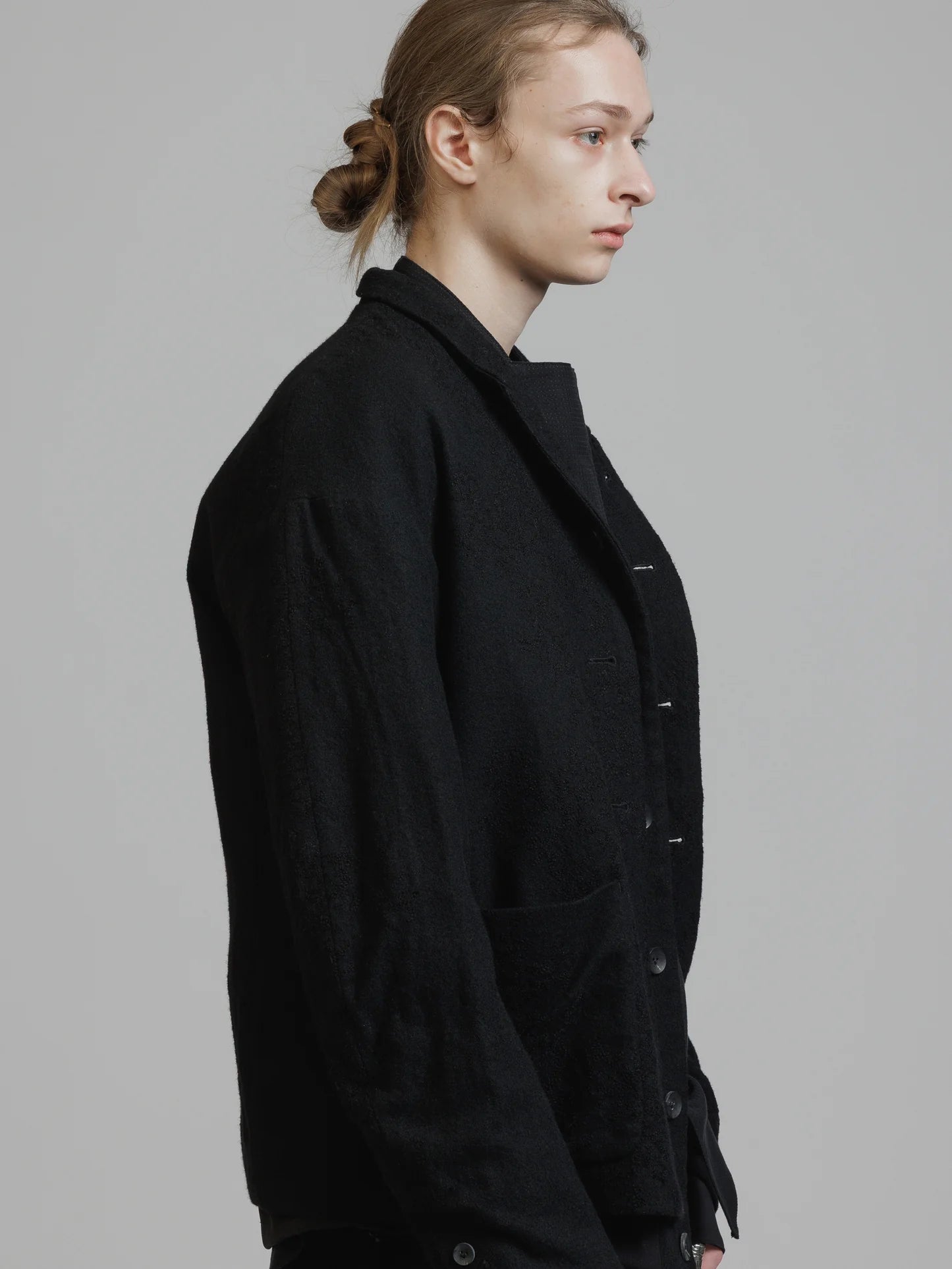The fabric is a blend of linen and wool, providing warmth along with a soft thickness and elasticity, resulting in a cozy finish.