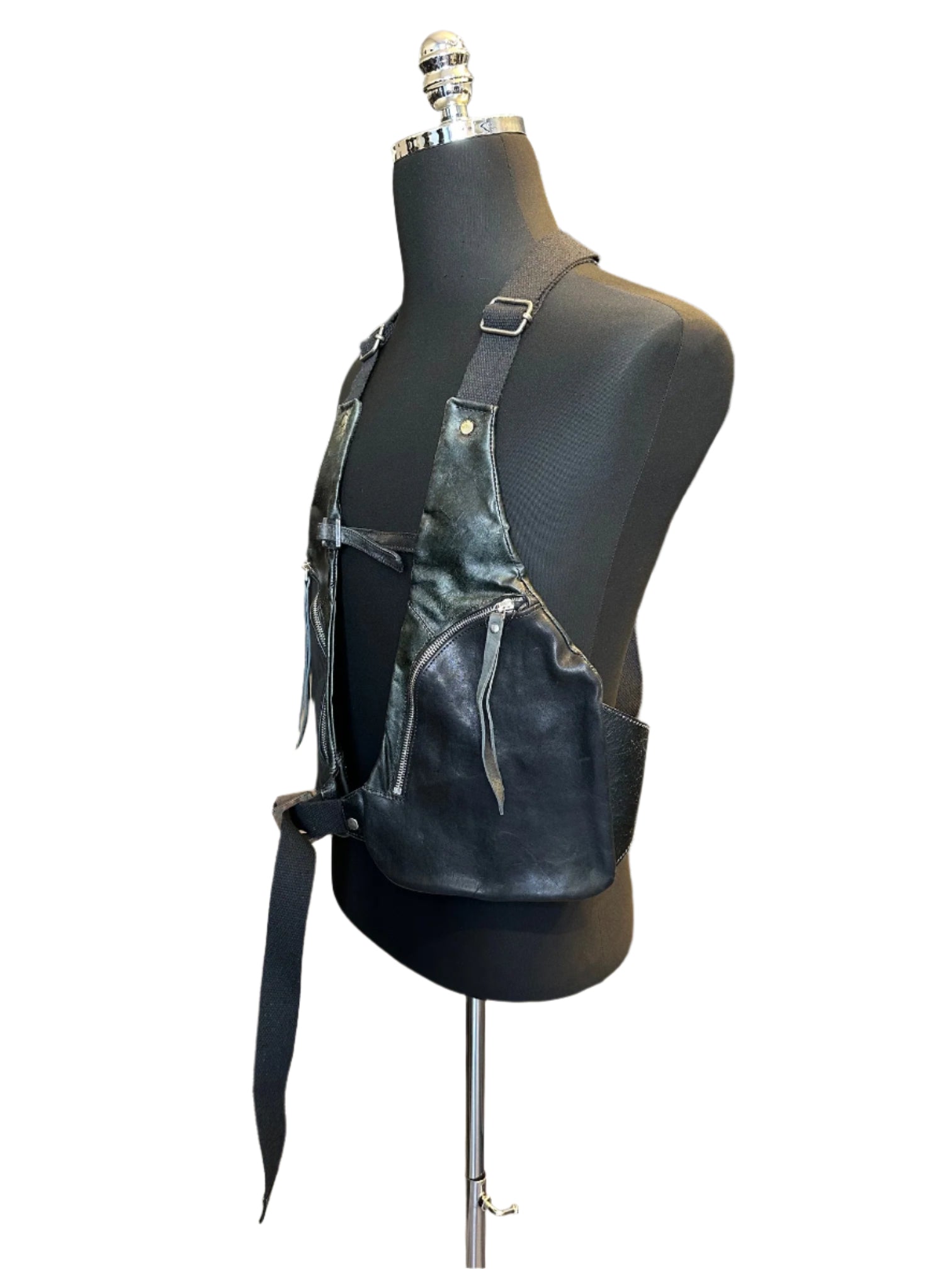 Each side is opened by a spiral Excella zipper showing the inner pocket. Vest bag is adjustable at the shoulder and waist strap.
