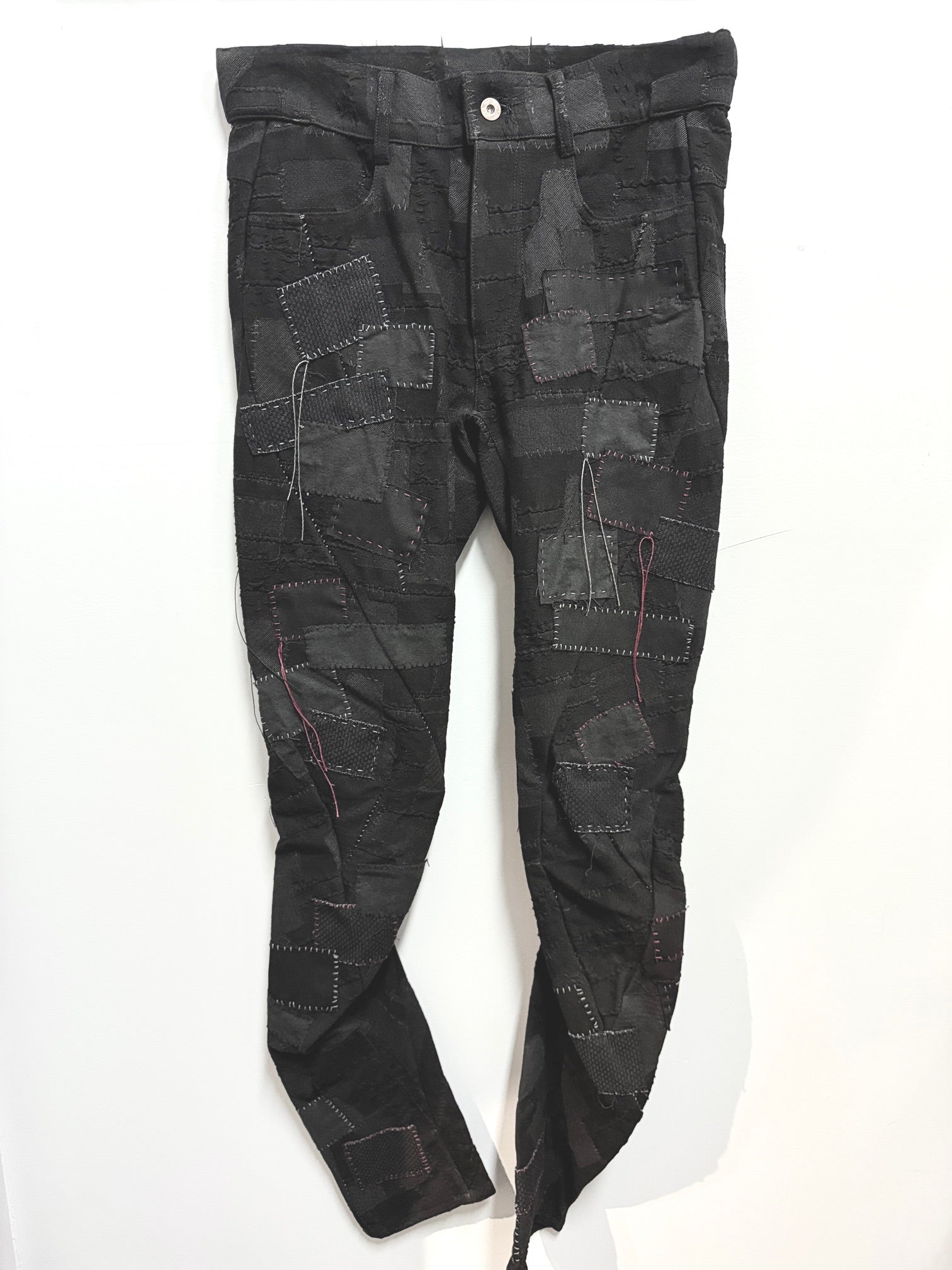 Original jacquard fabric showcasing patchwork inspired by Crust Core punk. Realistically portrays patchwork, hand stitching, and damage while incorporating stretch.