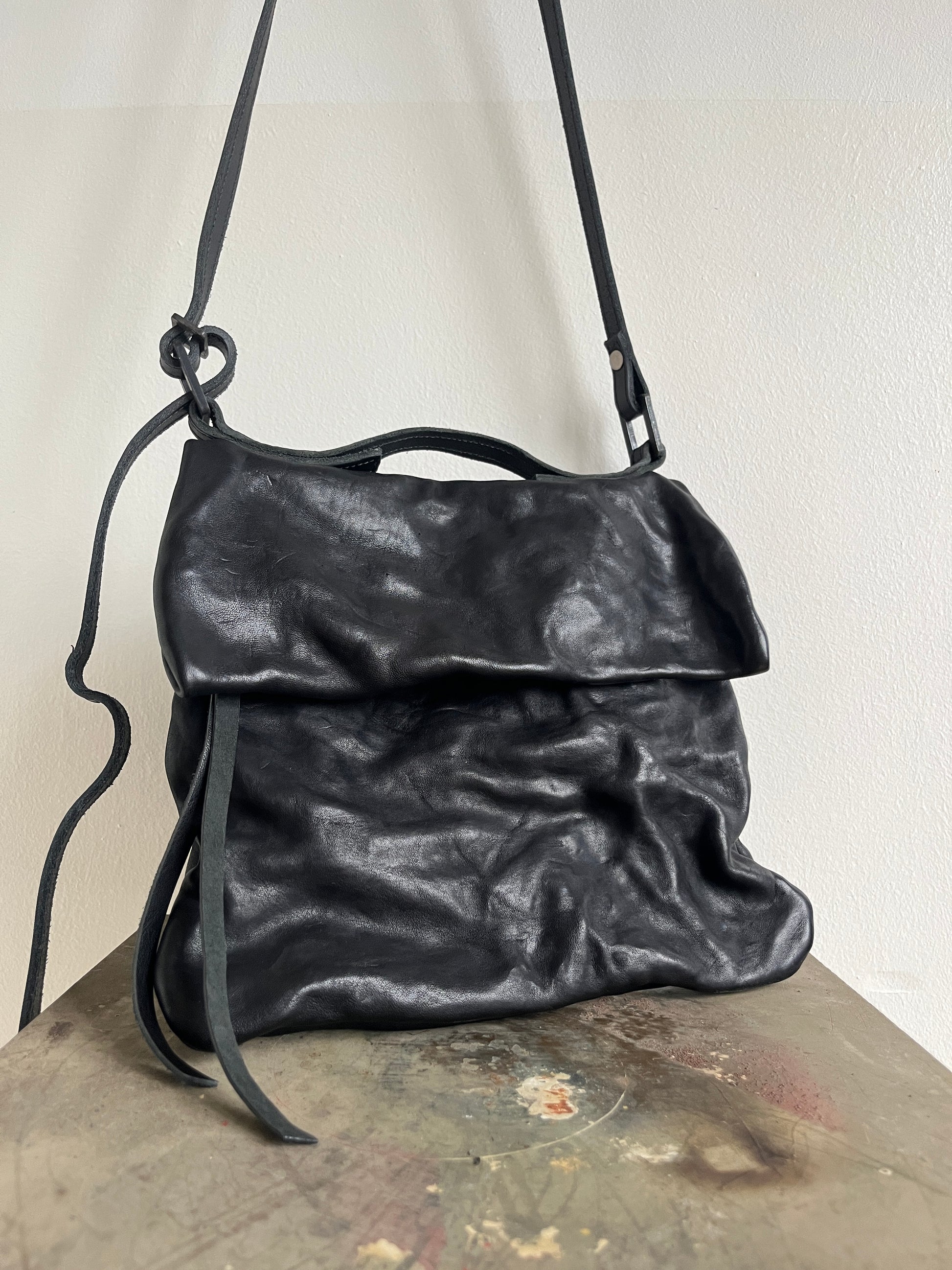 0.Hide tanned black Horse Leather Folded Messenger Bag from the Permanent Collection is crafted from 100% vegetable-tanned horse shoulder, with raw hides sourced in Europe and tanned in Tuscany. This bag features a durable Linen, ‘‘Rip-stop’’ leather pocket, Excella zipper leather design, and an adjustable bull leather strap for versatile carrying.