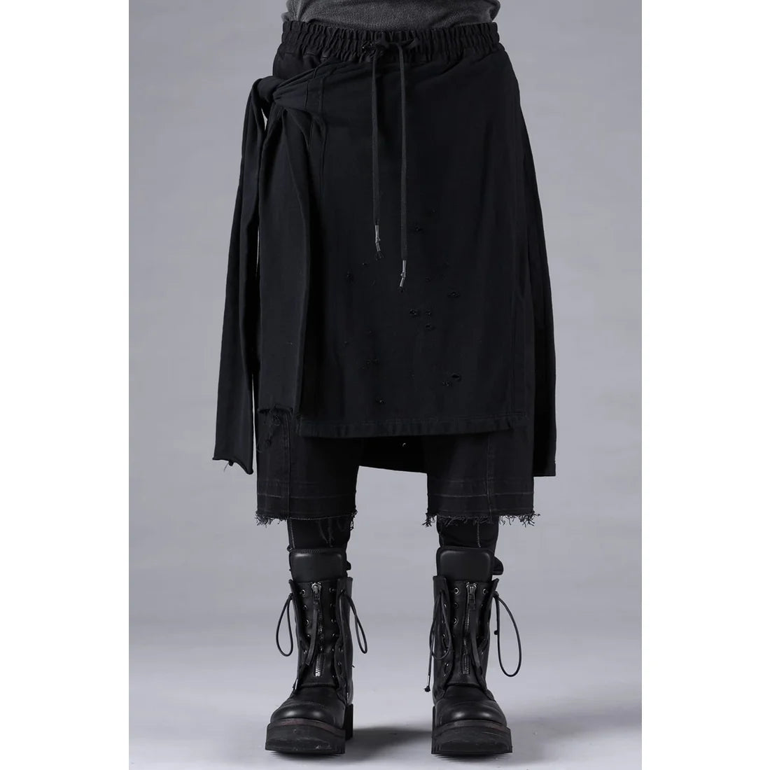 Black Stretch Denim Damage Apron Wide Cropped Pants