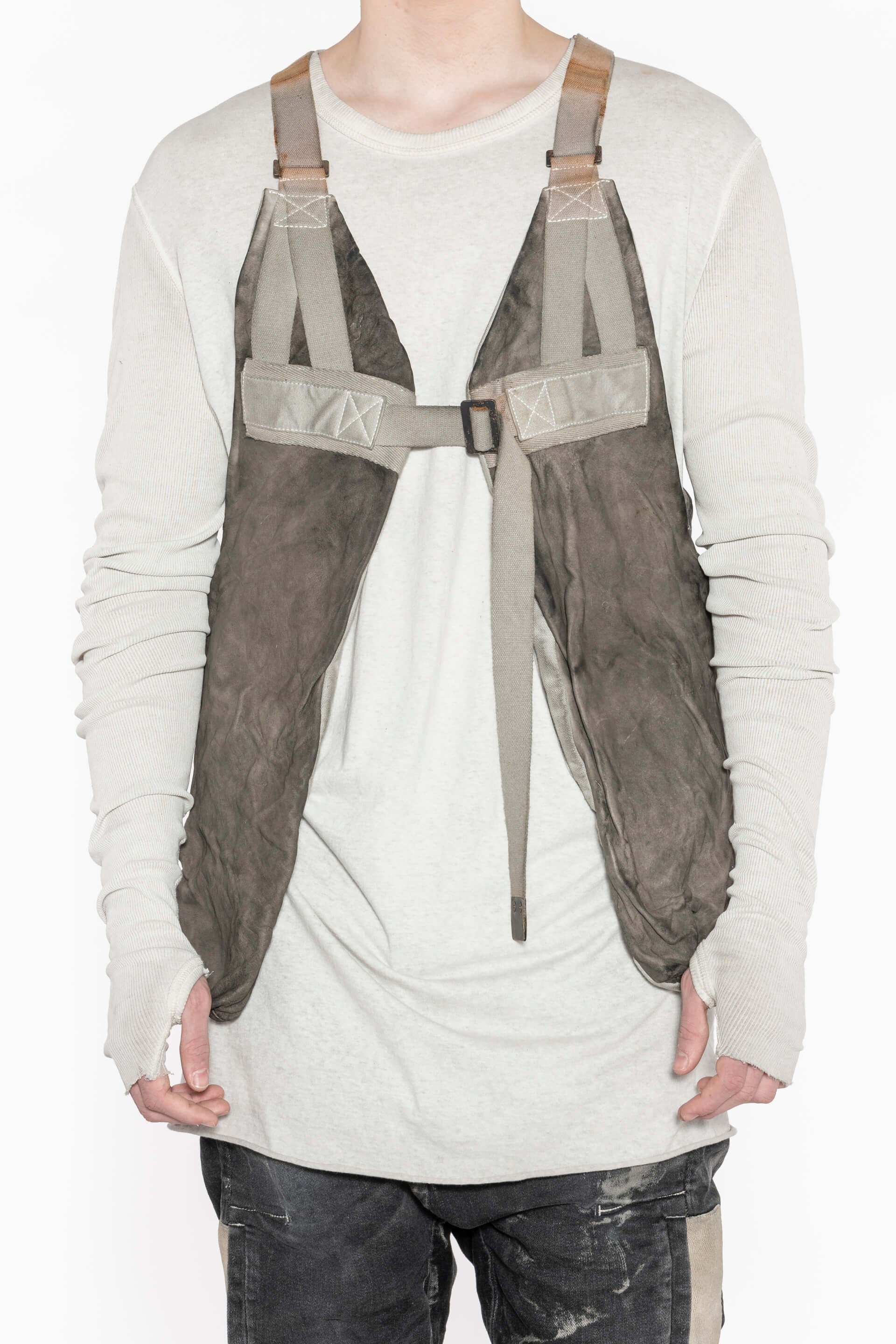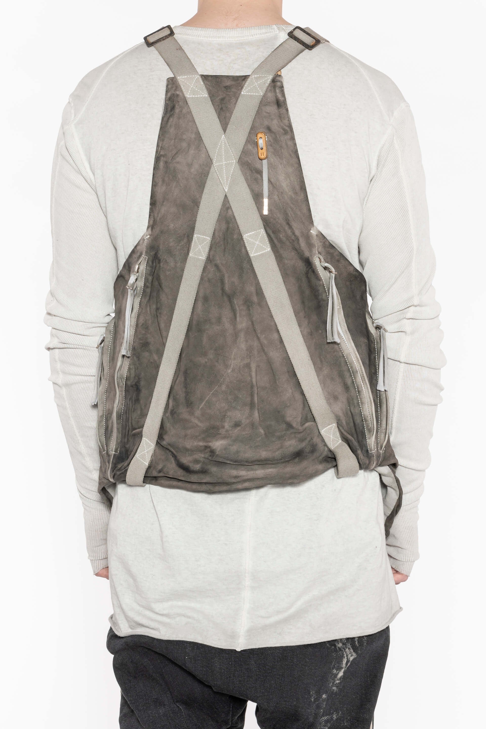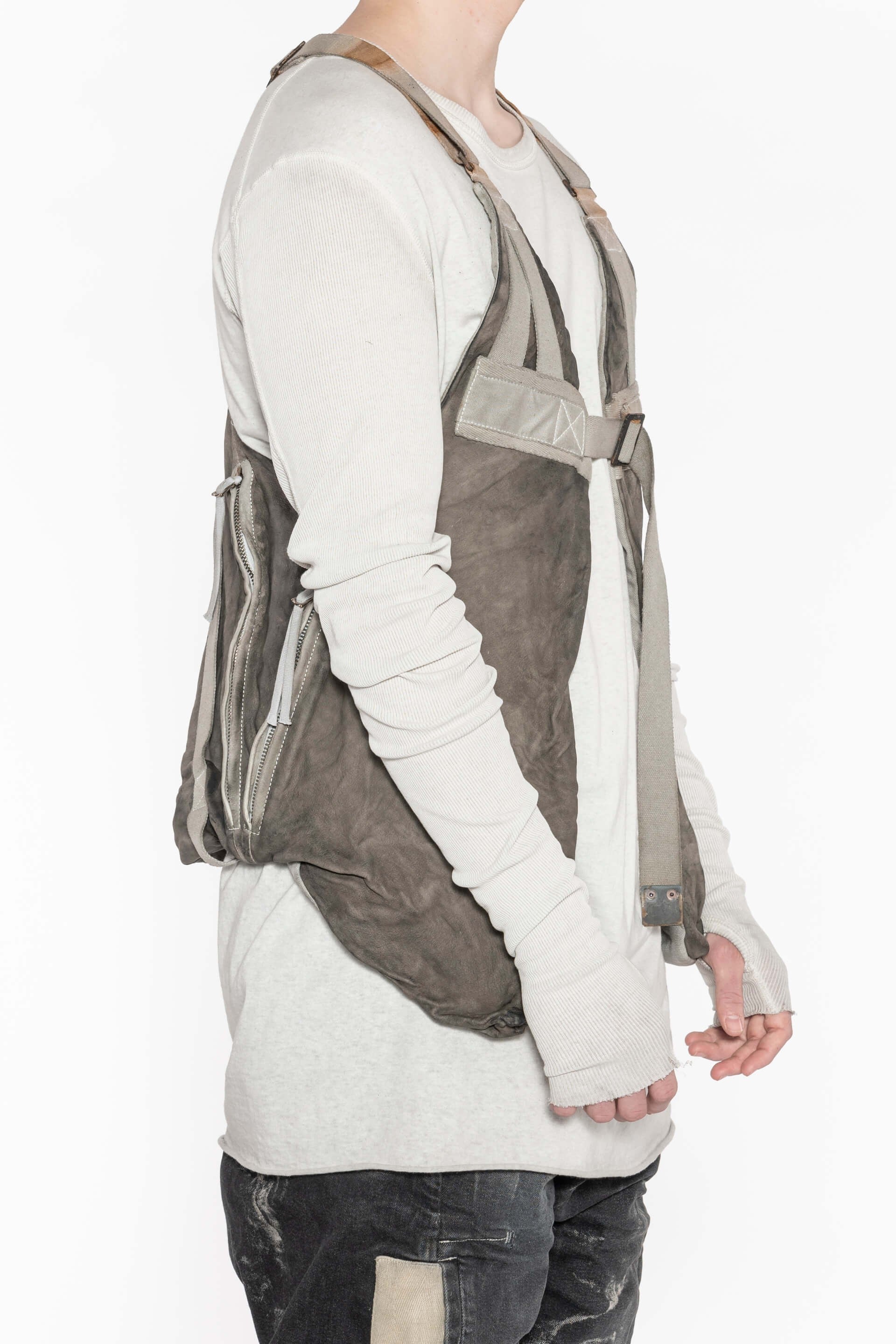 0075 / VESTBAG 2.1 / CARBON GREY / FMM20006 SUMMARY Two Shoulder Vest Bag crafted from Natural White Tanned Kangaroo Skin in Carbon Grey. DESCRIPTION Body molded two shoulder vest bag crafted from natural white tanned kangaroo skin and object dyed. Adjustable straps. Oxidized metal closure at center front. Two side zipped pockets on front and two side pockets on back. Signature Boris Bidjan Saberi tag with detail in Sterling Silver 925 – 0,6 gr. Material: 100% natural white tanned kangaroo skin outside, 100% cotton inside. Fabric: FMM20006. Treatments: Object Dyed, Body Molded.