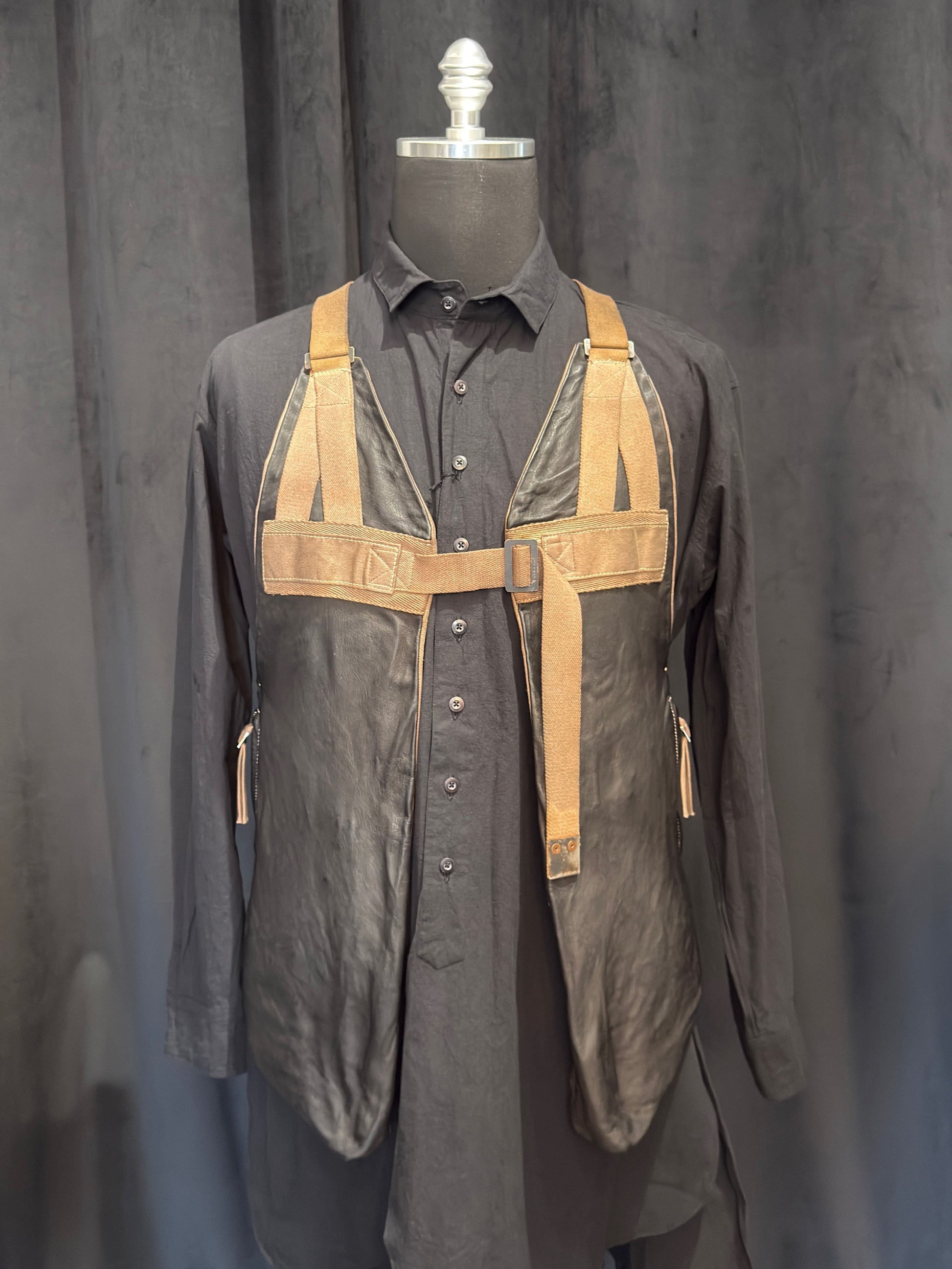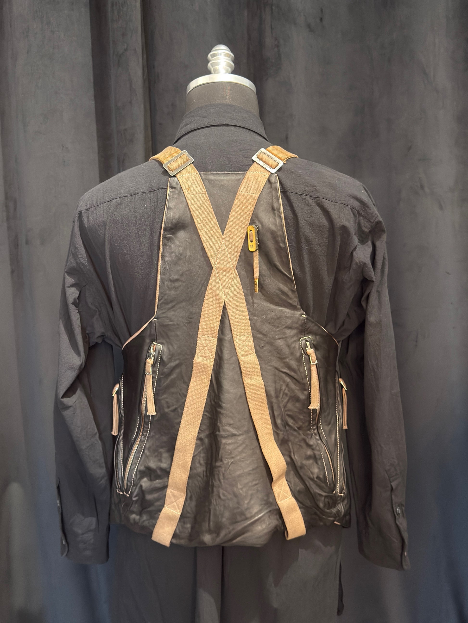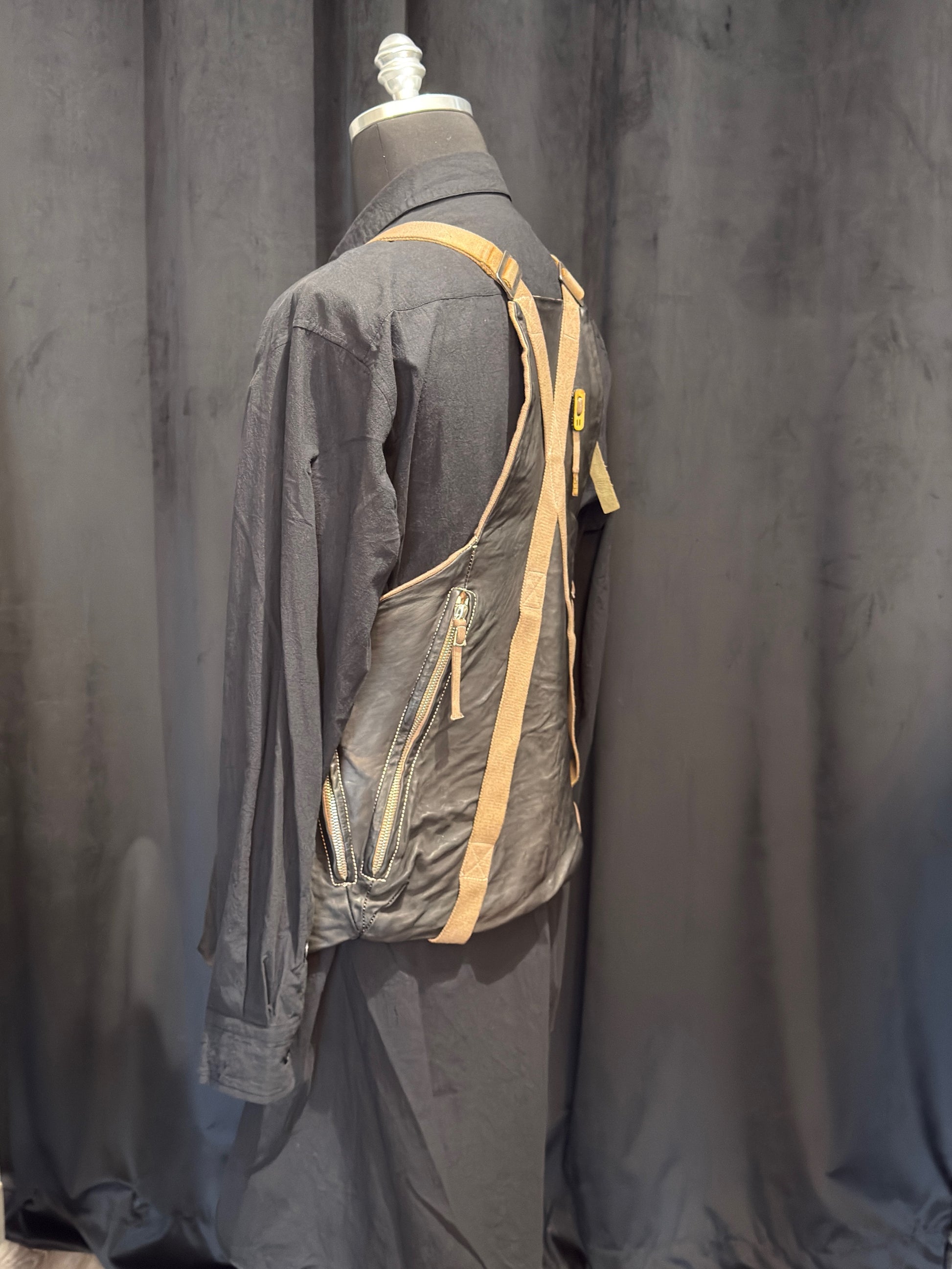 0075 / VESTBAG 2.1 / CARBON GREY / FMM20006 SUMMARY Two Shoulder Vest Bag crafted from Natural White Tanned Kangaroo Skin in Carbon Grey. DESCRIPTION Body molded two shoulder vest bag crafted from natural white tanned kangaroo skin and object dyed. Adjustable straps. Oxidized metal closure at center front. Two side zipped pockets on front and two side pockets on back. Signature Boris Bidjan Saberi tag with detail in Sterling Silver 925 – 0,6 gr. Material: 100% natural white tanned kangaroo skin outside, 100% cotton inside. Fabric: FMM20006. Treatments: Object Dyed, Body Molded.