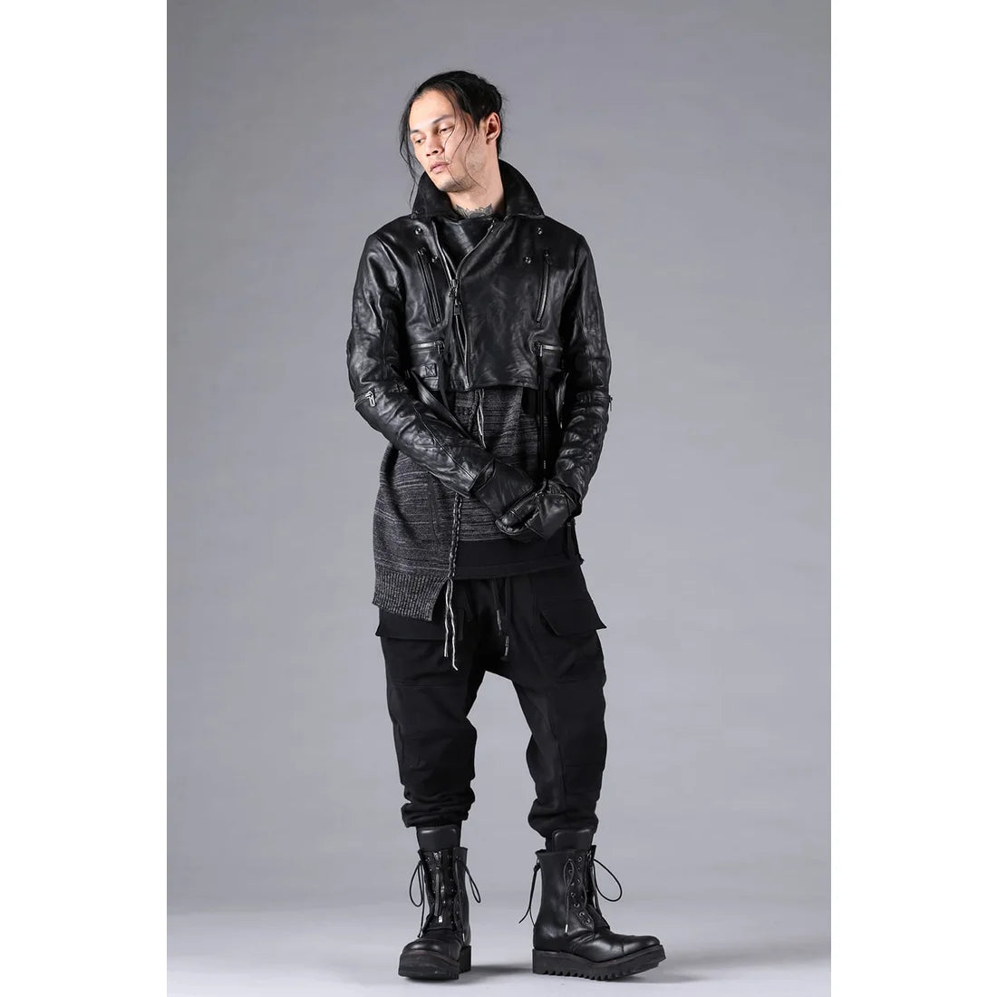- Hand-stitched seams emphasize the unbalanced construction.