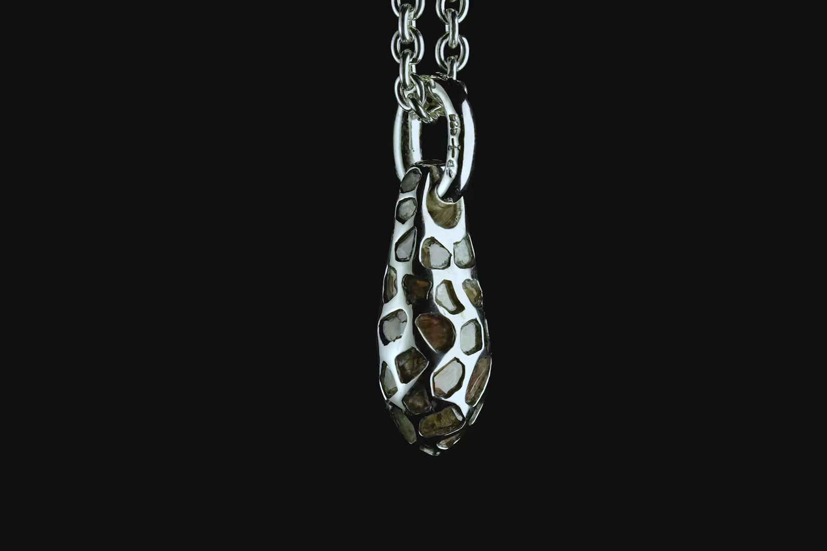 Mega Pavé is extreme stone setting. Breaking traditional norms, diamond slivers are individually carved into the wax master of every item before casting.