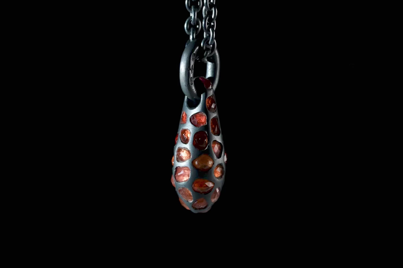 | Colors: | KA:Black Sterling. Black Sterling is a surface oxidation of sterling silver. This finish may fade over time, which can be considered an enhancement. Please note that Black Sterling tends to appear darker in photograph than in person.The finish can be re-blackened easily with Liver of Sulfur, available at most jewelry suppliers.OSAF:Orange Sapphire Slab (Faceted). |