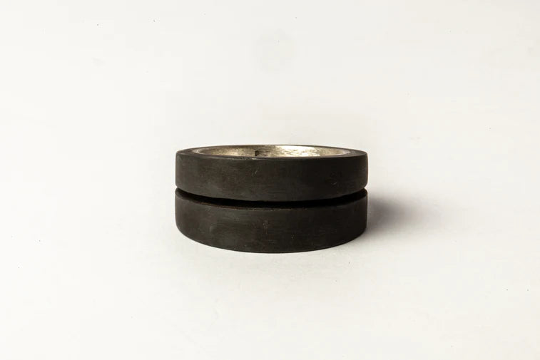 KZA:BLACK BRONZE + INNER SILVER. Blackened white bronze with a fused interior layer of sterling silver |