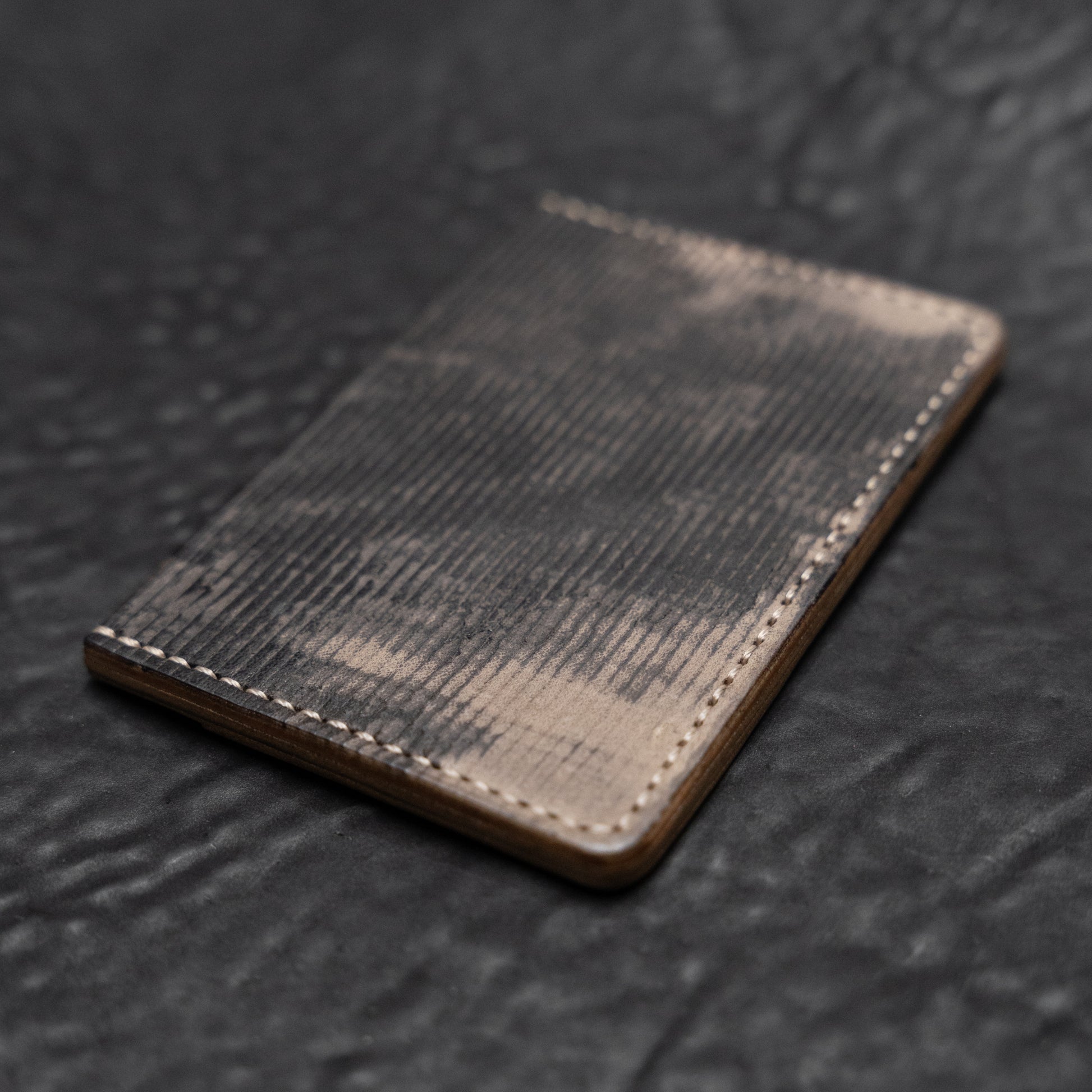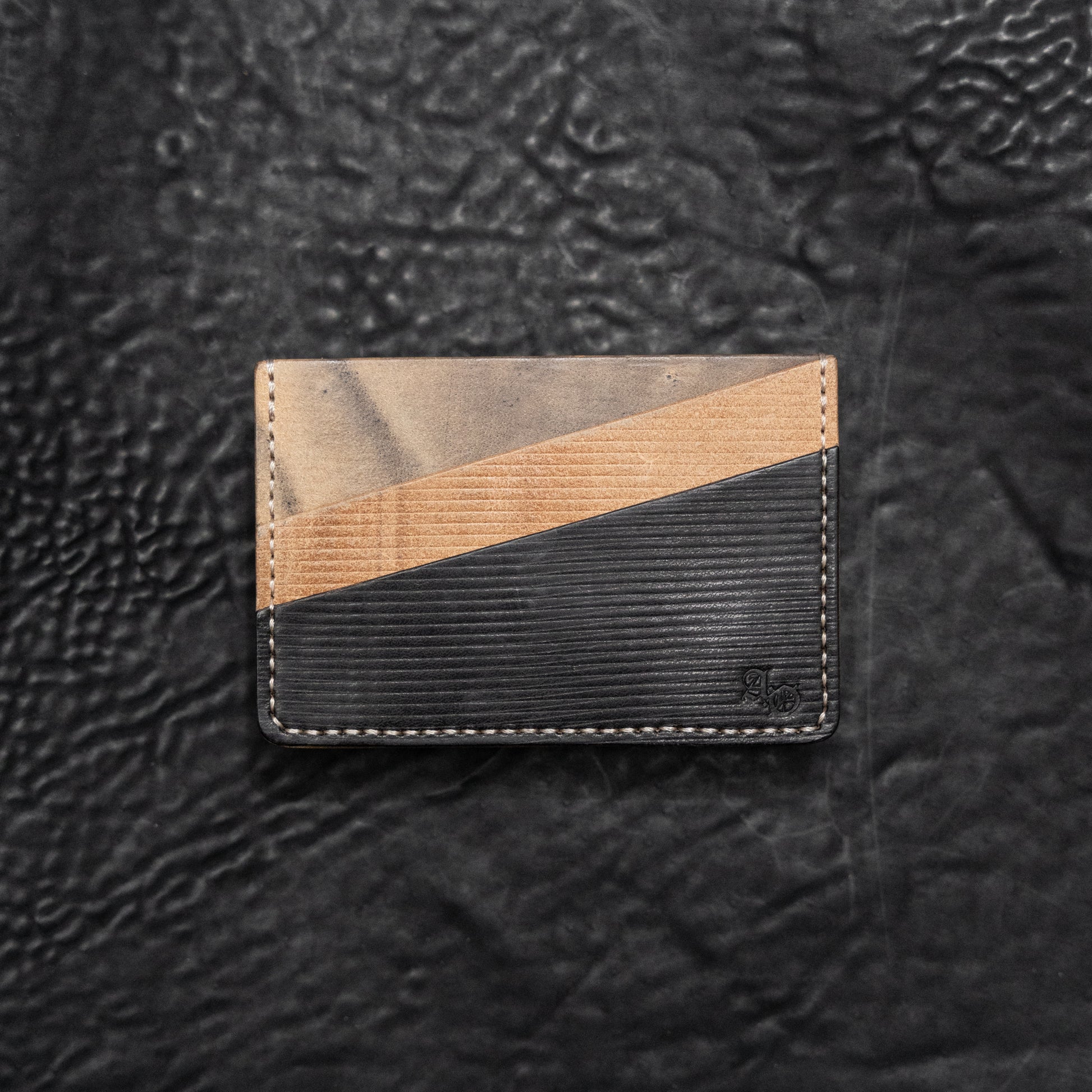 Featuring a compact silhouette, the card case holds up to 4 cards (2 on each slot) with a center compartment for two more cards or folded bills. Each piece is meticulously hand-stitched and finished in our studio.