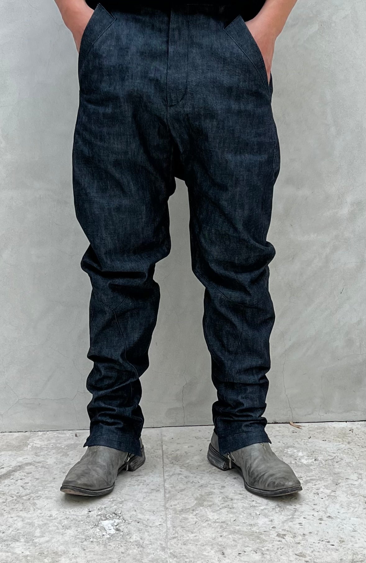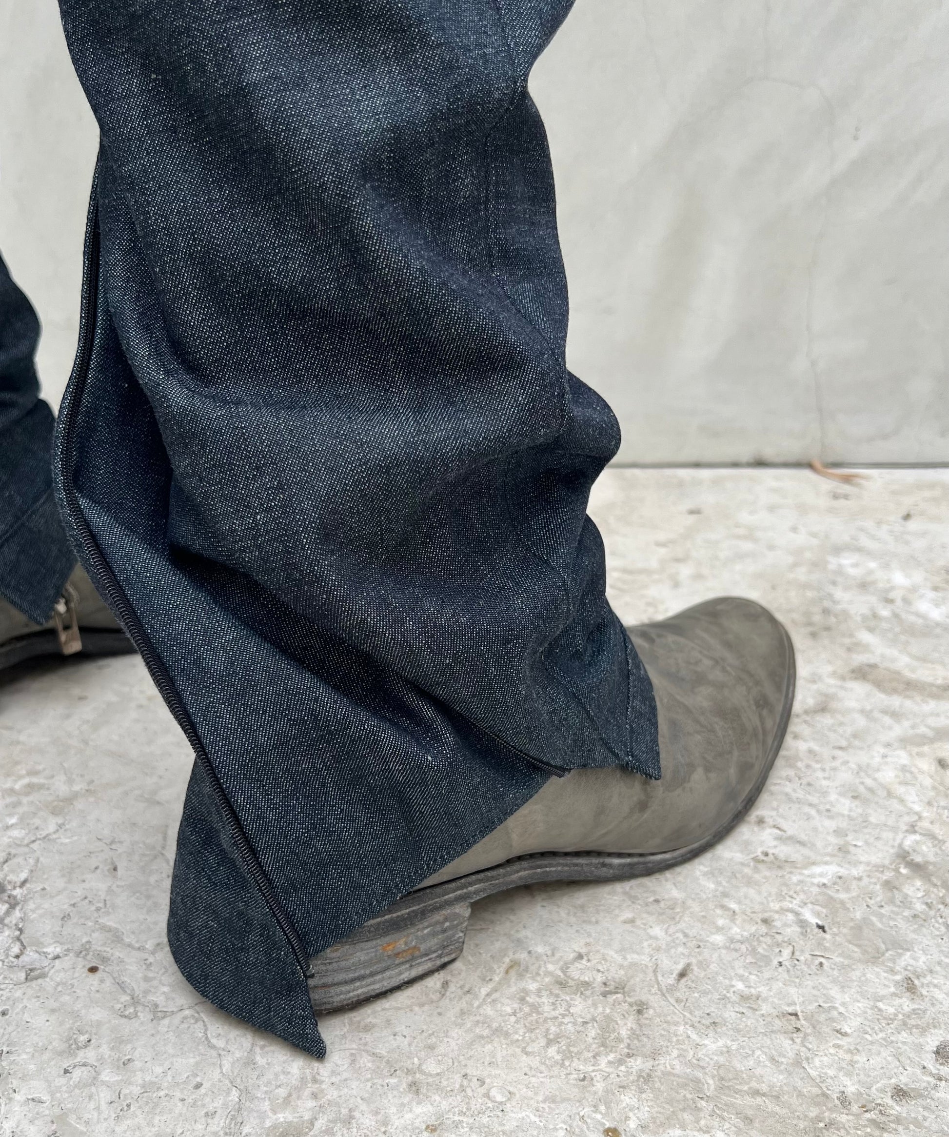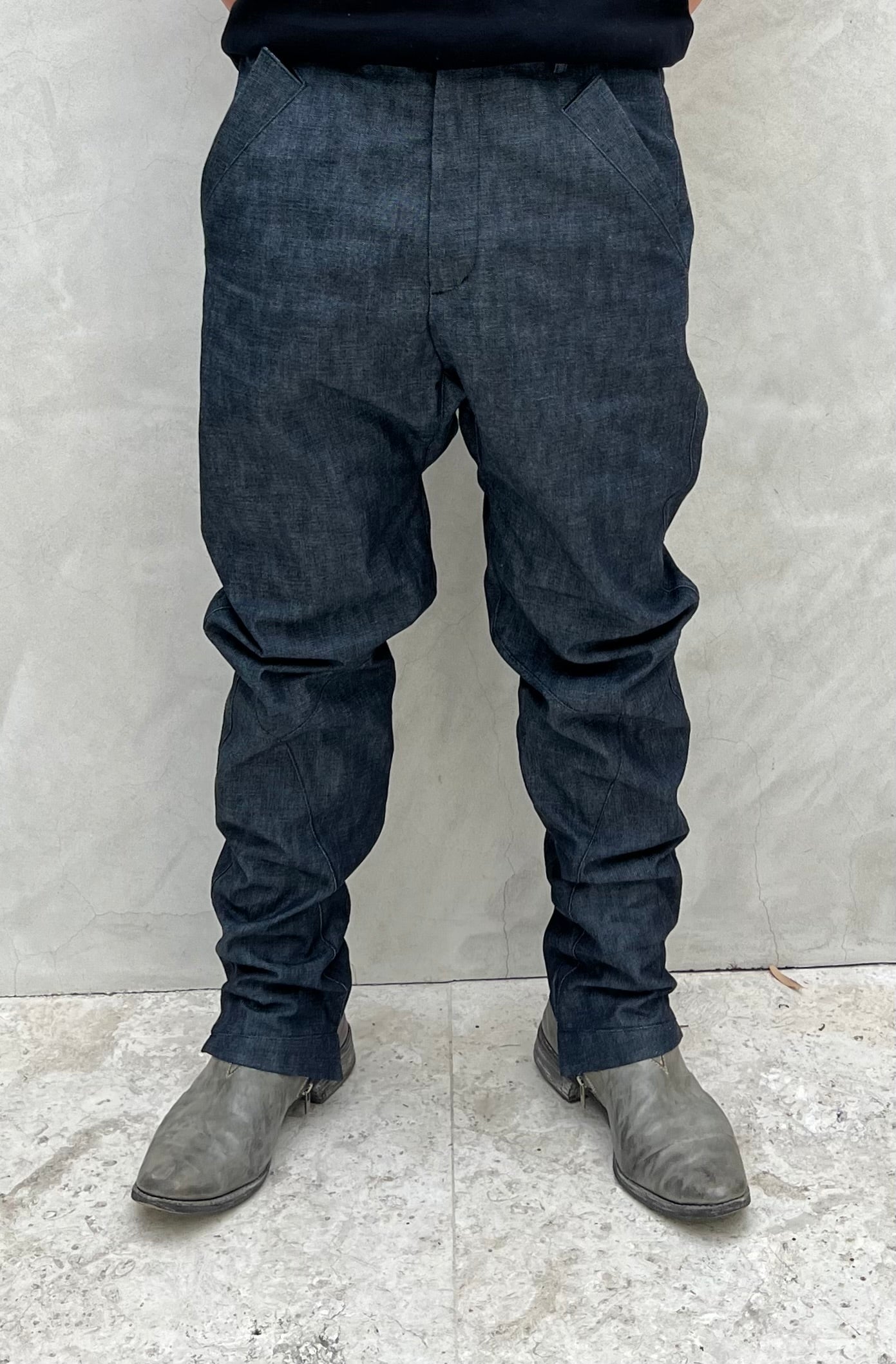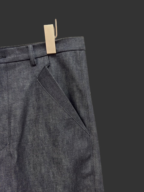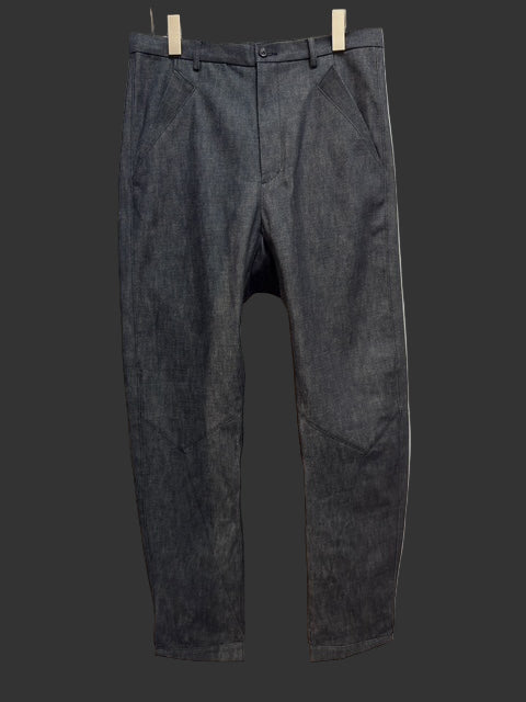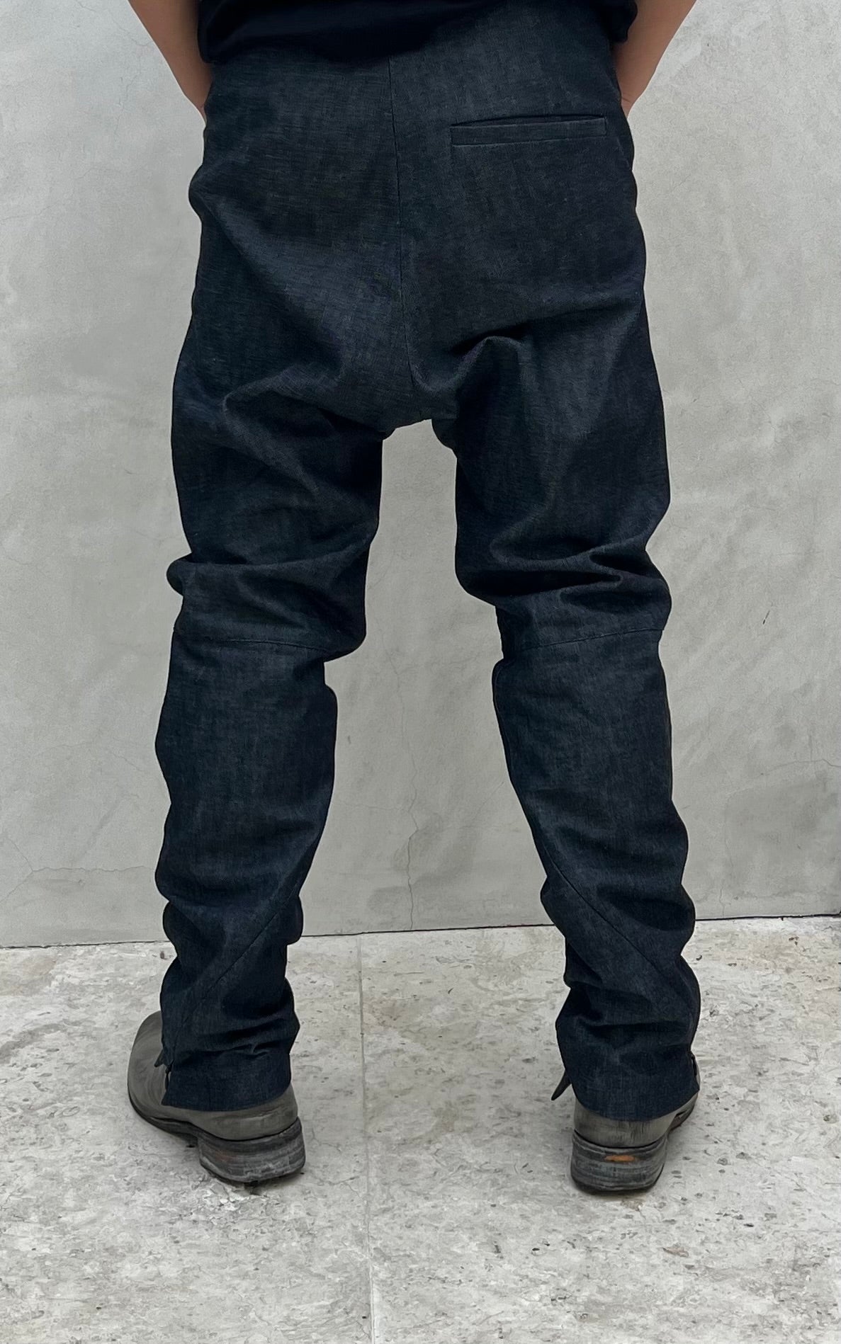 XD2 is a relaxed fit, a slimming straight-leg trouser in indigo Zimbabwe cotton denim fabric made in Okayama, Japan. The fit is eased, with a semi-drop crotch rise and flared, angled front pockets. The bottom hem features a signature diagonal zip gusseted closure for ergonomics and styling, expanding or slimming the end width by up to about 3cm