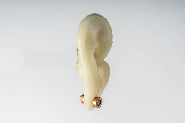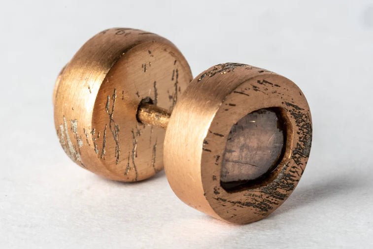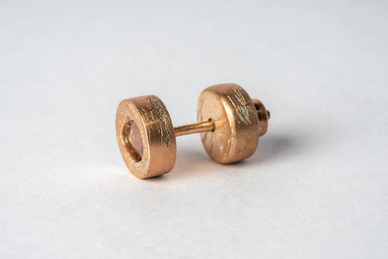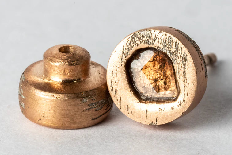 AMA:STERLING ACID ROSE. Sterling silver substrate is electroplated with 18k Rose Gold and then dipped into acid to create the subtly destroyed surface. The concentration of the plating solution, air temperature and time in the acid bath all play integral roles in the final result and exist in a delicate balance. No two items are the same and these nuances / variations should be seen as a characteristic of the product. DIA:ROUGH DIAMOND. The stones used in this item are cuts of diamond material that are removed from a larger chunk of diamond as they are attempting to get to the perfect diamond in the center. Each stone fragment and shape are absolutely unique. |