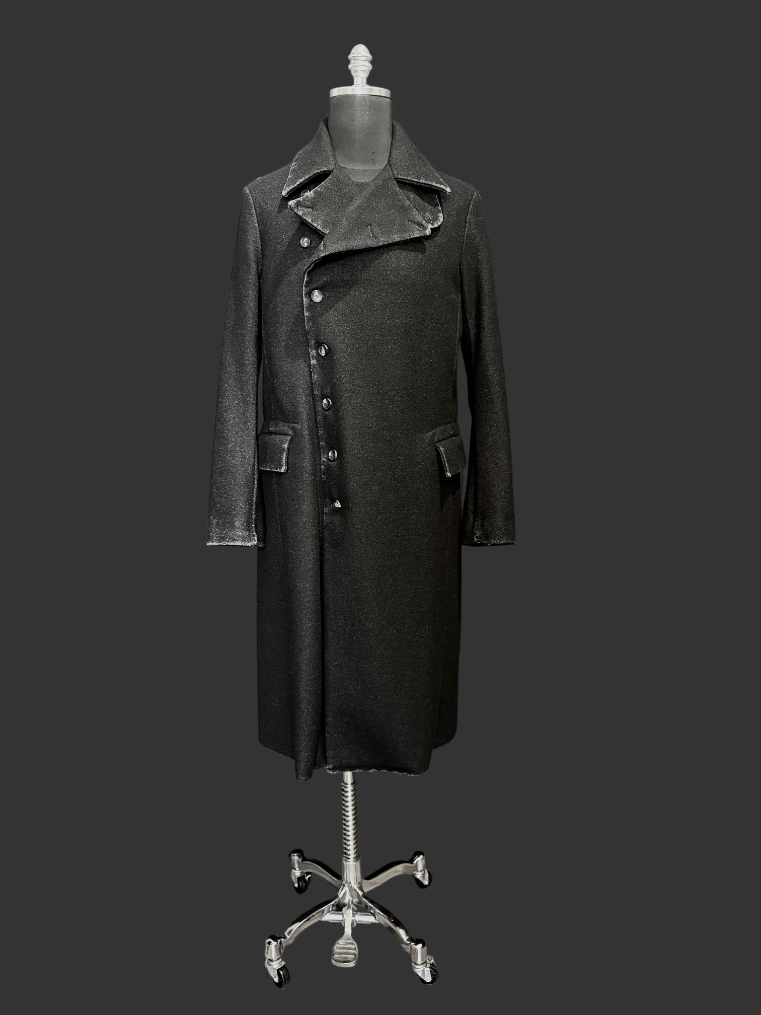 Vigorously washed Melton asymmetric button coat with 8 Masnada personalized horn buttons.