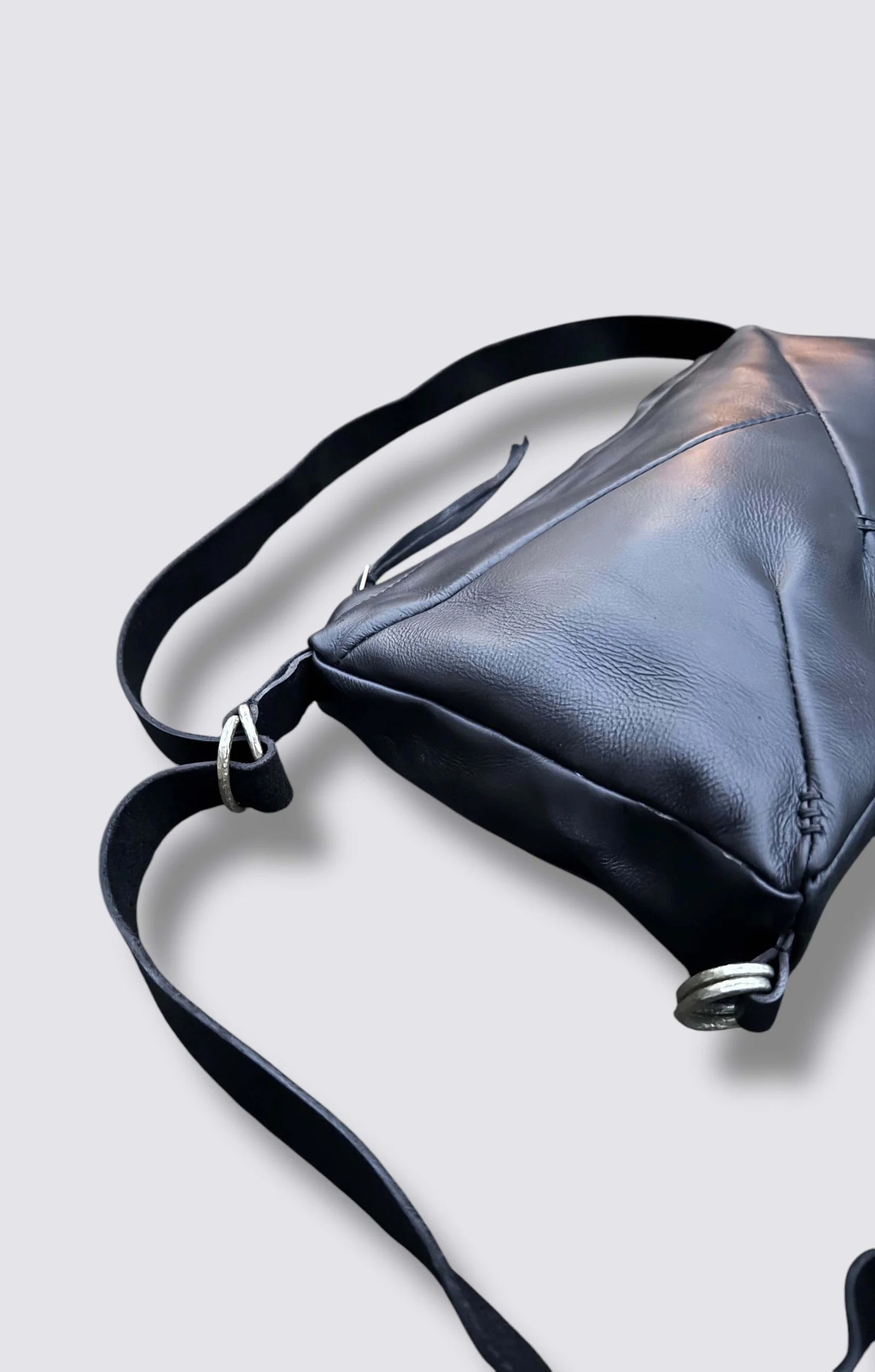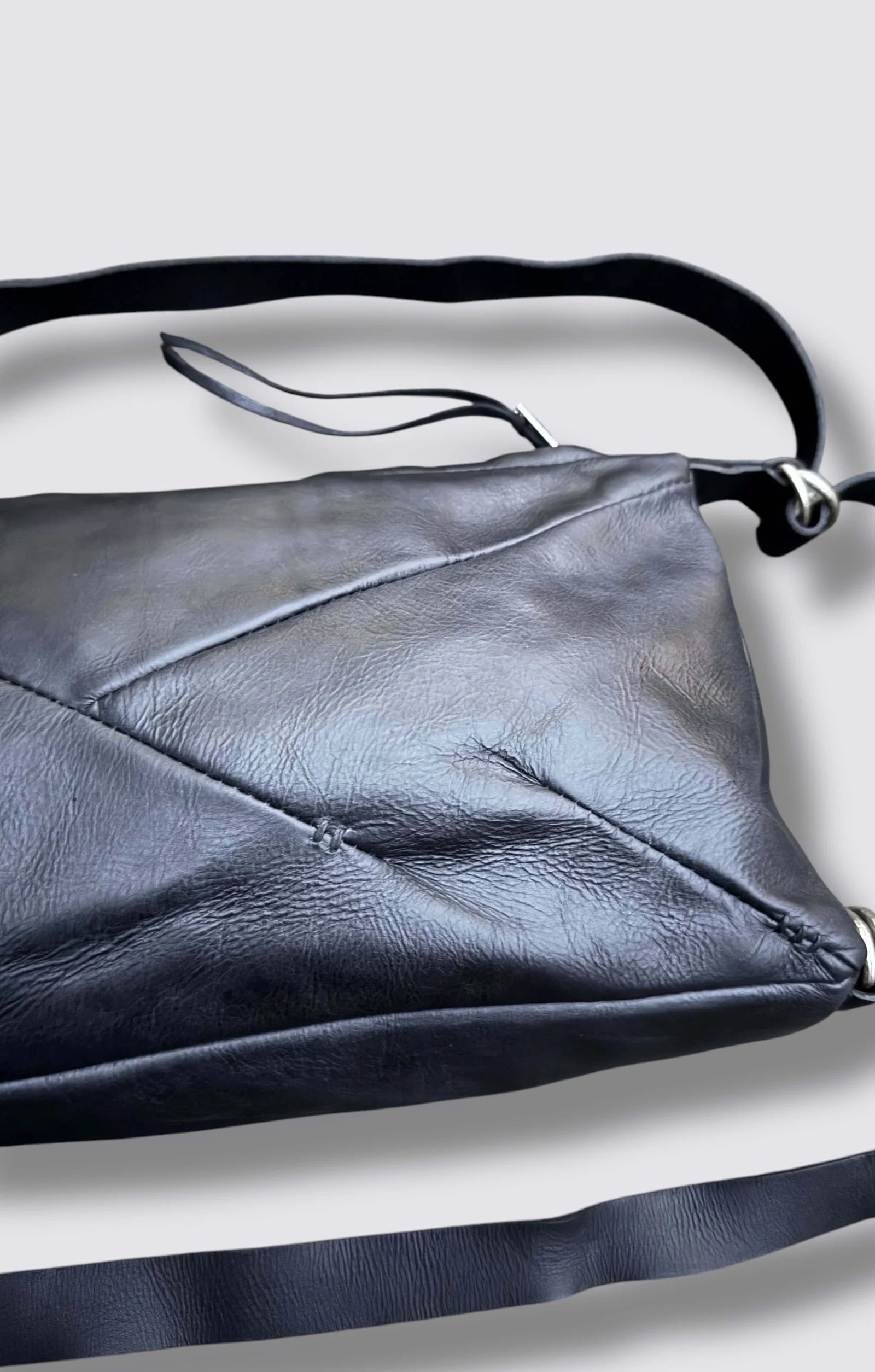 The leather’s hand-selected quality speaks to durability while offering a tactile finish that grows more refined through daily use. The design is defined by strong graphic seam lines that not only create a distinctive visual language but also emphasize the bag’s structure. Each seam is reinforced with hand stitches, meticulously sewn with waxed thread for longevity and a subtle handcrafted detail. The hardware, made from hand-hammered metal, introduces a raw, industrial contrast to the supple leather, while ensuring strength and resilience in everyday wear.Functionality lies at the core of this piece: its volume and size are fully adjustable, allowing the bag to adapt seamlessly from light daily carry to heavier loads.